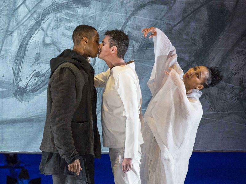 Parimenti ascetica la rarefatta resa visiva di Peter Sellars che è tutta giocata sui corpi poiché la scenografia consiste solo in un fondale grigio monocromo che assomiglia a una parete con incisioni rupestri (si tratta di un dipinto dell’artista Julie Mehretu), salvo poi rivelarsi semitrasparente e sollevarsi come un velo nella seconda parte quando la scena viene riempita, si fa per dire, dai movimenti aggraziati della danzatrice Nora Kimball-Mentzos. La regia video con i suoi primi piani e il nervoso montaggio aggiunge giusto pathos a questa non-azione scenica. Il baritono Davone Tines dà voce ai personaggi terreni del sacerdote e del pescatore, Philippe Jaroussky a quelli soprannaturali. Nella loro diversità, entrambi sono due perfetti interpreti vocali.