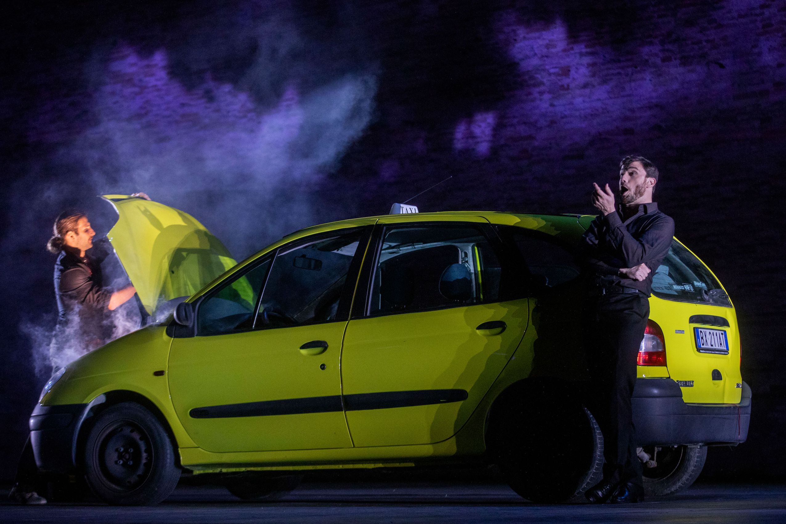 È il caso del Macerata Opera Festival che ha luogo in quella singolare arena della cittadina marchigiana, edificio di forma semiellittica costruito nella prima metà dell’Ottocento per ospitare i tornei di pallone a bracciale della squadra locale. Qui Davide Livermore allestisce un Don Giovanni che utilizza automobili in scena così come aveva fatto poche settimane fa Damiano Michieletto per il suo Rigoletto. Ma mentre a Roma le automobili erano parcheggiate disordinatamente in quello che sembrava un cinema drive-in, qui il taxi giallo di Leporello e il suv nero del Commendatore scorrazzano con stridore di gomme sull’immenso palcoscenico completamente vuoto dello Sferisterio.