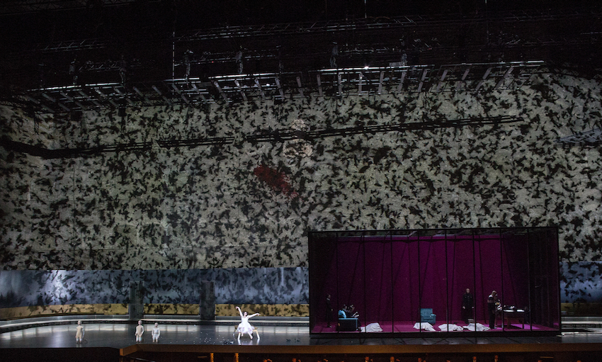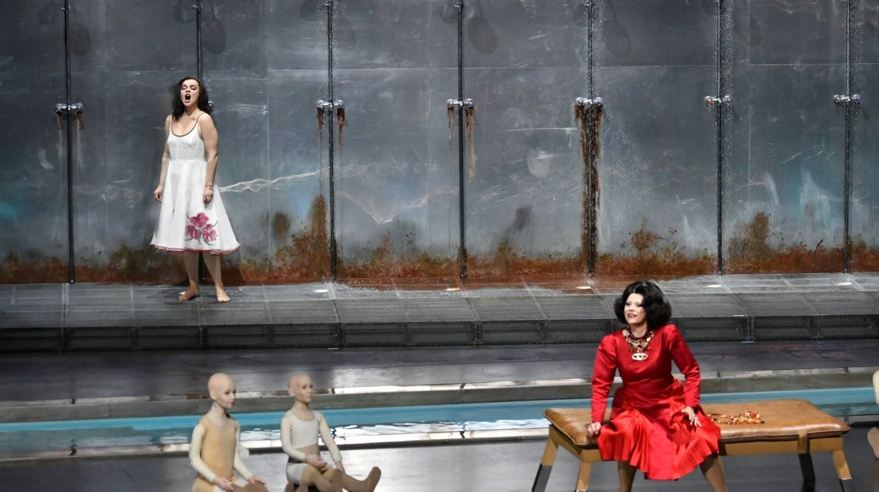 La parola Blut ricorre sedici volte nel breve libretto, dove non ci sono risparmiati dettagli splatter (1), ma il regista non ha la mano troppo pesante, la sua messa in scena è sottilmente inquietante e questa volta pienamente convincente. La scenografia, come al solito appropriata di Małgorzata Szczęśniak, utilizza il particolare spazio scenico per costruire un ambiente che ha una sua regalità per le proporzioni se non per i particolari: un ambiente vetrato per l’interno della reggia e una stretta vasca d’acqua che attraversa il palcoscenico per quasi tutta la sua lunghezza, i cui riflessi si proiettano su una parete di docce striate di ruggine color sangue. I caratteristici archi scavati nella roccia del fondo scena sono murati per aumentare il senso di claustrofobia della vicenda.