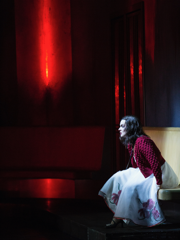 Elektra è una tragedia al femminile: tre donne sono le protagoniste assolute e richiedono interpreti di grande calibro. Qui ci sono. Due affermati soprani lituani danno voce alle sorelle Elettra e Crisotemide. La prima ha la voce di Aušrinė Stundytė, che delinea un’Elettra non particolarmente invasata, ma determinata, non vestita di stracci ma in un abitino bianco col quale vuole esprimere forse una fanciullezza perduta, un golfino rosso (tutte e tre le donne hanno qualcosa di rosso addosso) e una sigaretta perennemente accesa – e il regista giocherà con la Licht (luce, in inglese light) invocata da Egisto nel suo unico colloquio con Elettra, la quale gli offrirà invece la fiamma del suo accendino. La voce non ha la potenza sonora di certe ugole del passato, ma ha comunque una notevole proiezione negli spazi del teatro salisburghese (o per lo meno così sembra nella trasmissione televisiva), ma sottolinea una certa fragilità psicologica della donna a dispetto della sua terribile determinazione a vendicare col sangue la morte del padre. Qui non si sentono urla belluine, ma note di musica sempre cantate ed espresse con una grande tavolozza di colori da parte della Stundytė.