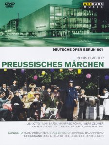 La stampa inglese aveva trovato fin da subito motivi di divertimento nell’evento, vedendolo come una conferma degli stereotipi sul popolo tedesco e la sua reverenza per l’onnipotenza del militarismo, il cui simbolo più sacro è l’uniforme. Anche Blacher e von Cramer prendono spunto da questa vicenda da “operetta” per un lavoro ironico che diventa la versione comica di Hauptmann Köpenick e che ha i suoi tratti salienti nel testo arguto e nella musica irriverente. Mentre il libretto gioca con la lingua (dove “Formen” fa rima con “enormen”, riferito alle rotondità anatomiche della figlia del borgomastro), la partitura saccheggia temi popolari, marcette e arriva a utilizzare un accompagnamento di semplici scale tonali (un famigerato studio pianistico di Czerny) per la scena del rigattiere. Che poi papà Fadenkreutz sia un soprano e la madre un basso conferma le intenzioni satiriche dell’autore. Ecco, forse nel 1950 siamo fuori tempo per prendere in giro la Prussia di fine secolo e la Germania ha ben altri problemi. Non è facile trovare molti spunti di attualità nel militarismo e nella venerazione all’uniforme in quei tempi o in quelli in cui viene registrata la messa in scena di Preußisches Märchen quale film-opera com’era usanza all’epoca, ossia nel 1974: dopo le recite alla Deutsche Oper ci si spostava negli studi televisivi della SFB (Sender Freies Berlin) per le riprese.