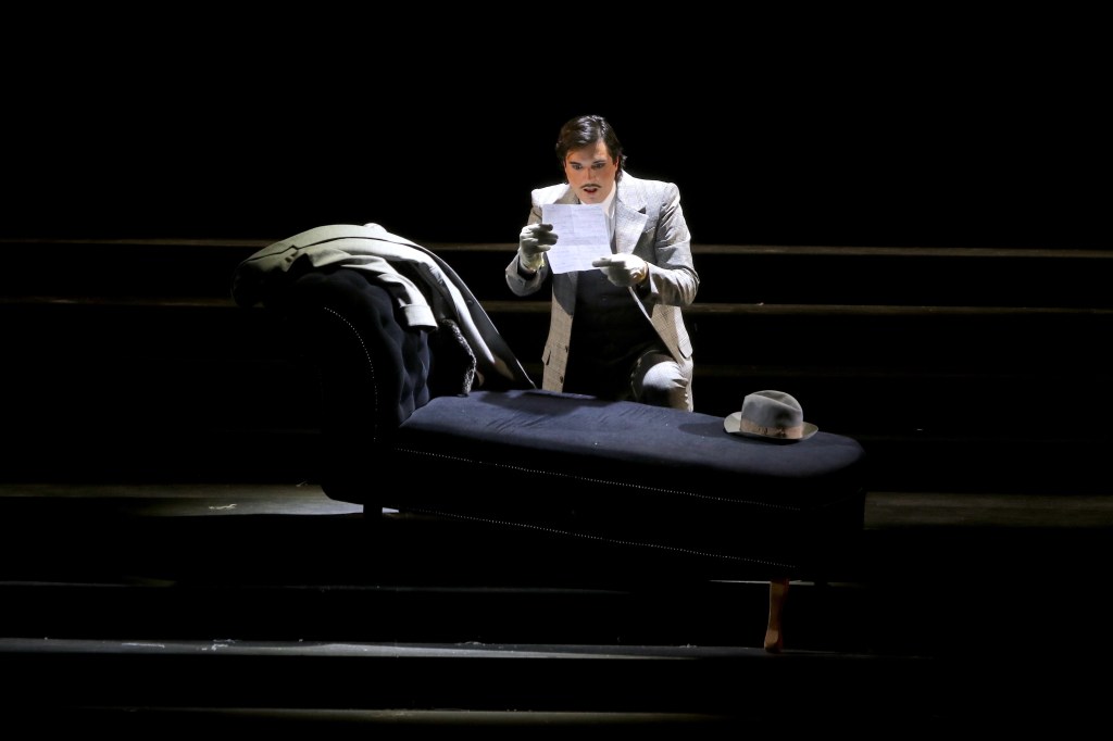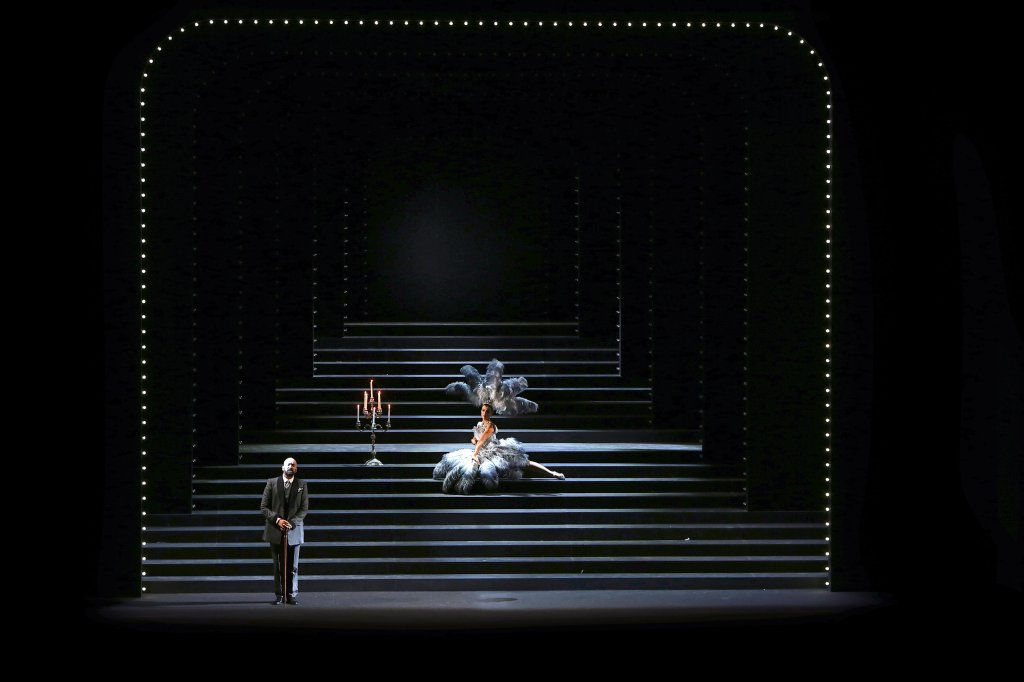 Il Trespolo tutore è un lavoro destinato a spazi molto più ridotti, ma se non altro qui quelli del Carlo Felice permettono il distanziamento in scena e in platea. Per di più i creatori dello spettacolo sono riusciti a fare di necessità virtù imbastendo una serata godibile per l’aspetto visivo con le scene di Leila Fteita e i costumi di Nicoletta Ceccolini. I registi Paolo Gavazzeni e Piero Maranghi scelgono gli anni ’30 per la loro ambientazione con una lunga e ripida scalinata incorniciata a vari livelli da lampadine luminose: Artemisia è una vamp con en tête e ventaglio di piume di struzzo, Trespolo sfoggia un lucido cilindro, Nino capelli impomatati e baffetti alla Clark Gable. L’ammiccamento al cinema muto dell’epoca avviene anche con i video in bianco e nero dei visi degli interpreti ripresi in smorfie espressive, ma non esiste una vera giustificazione per questa scelta e la drammaturgia è latente e non sfrutta certi momenti teatrali suggeriti dal testo, come gli equivoci del buio non realizzato, anzi proprio le luci qui sembrano fare difetto per imprecisione.