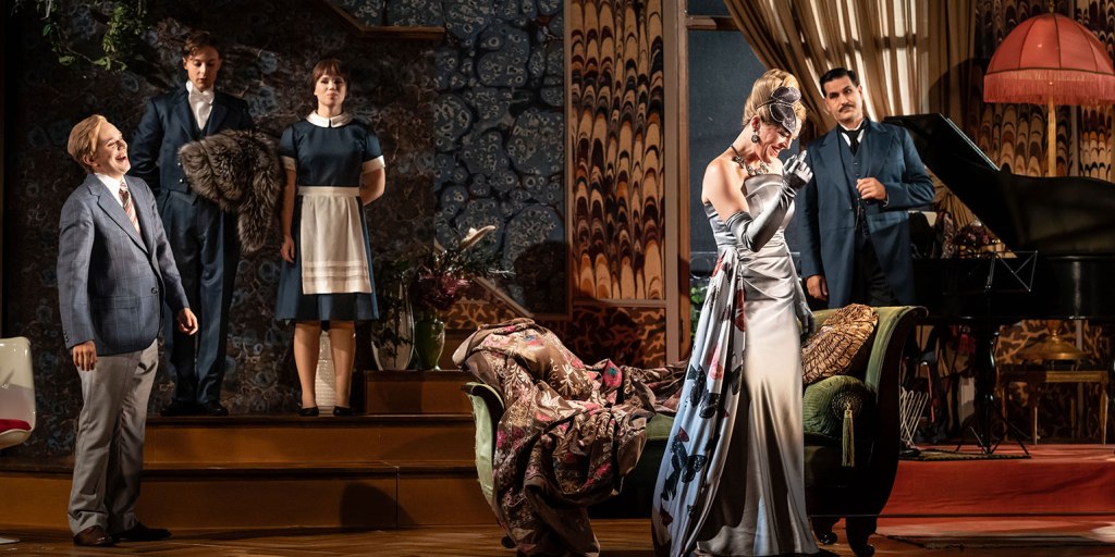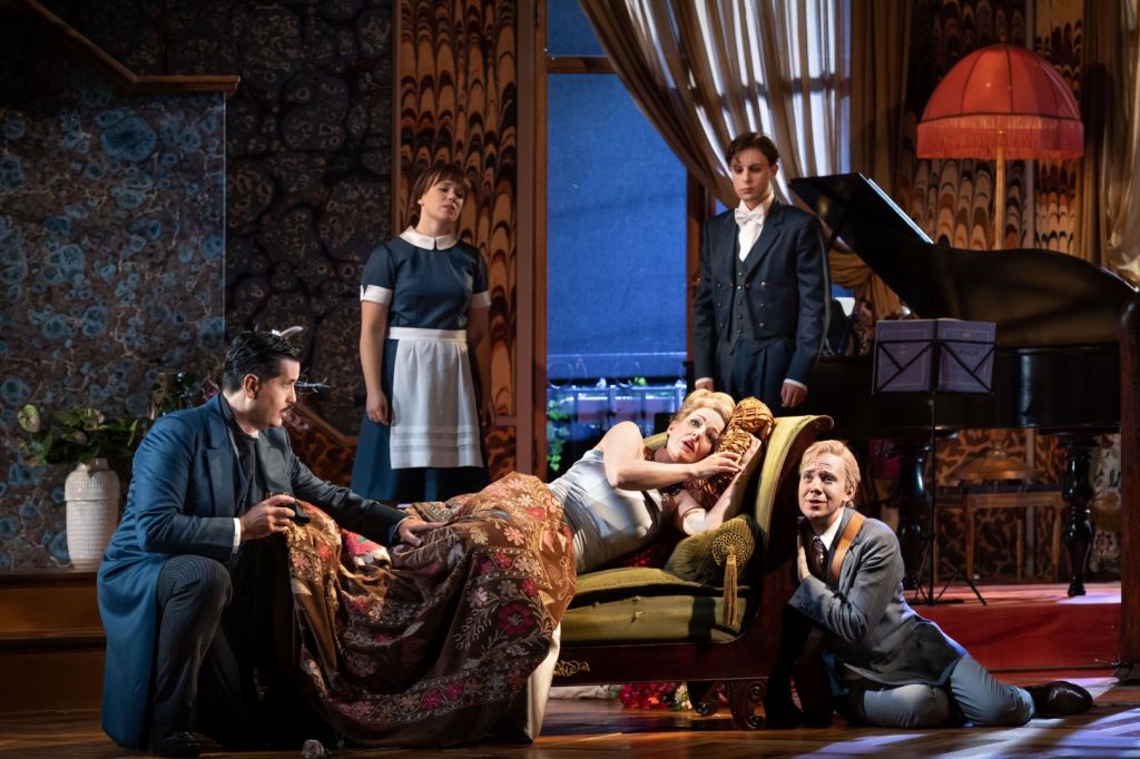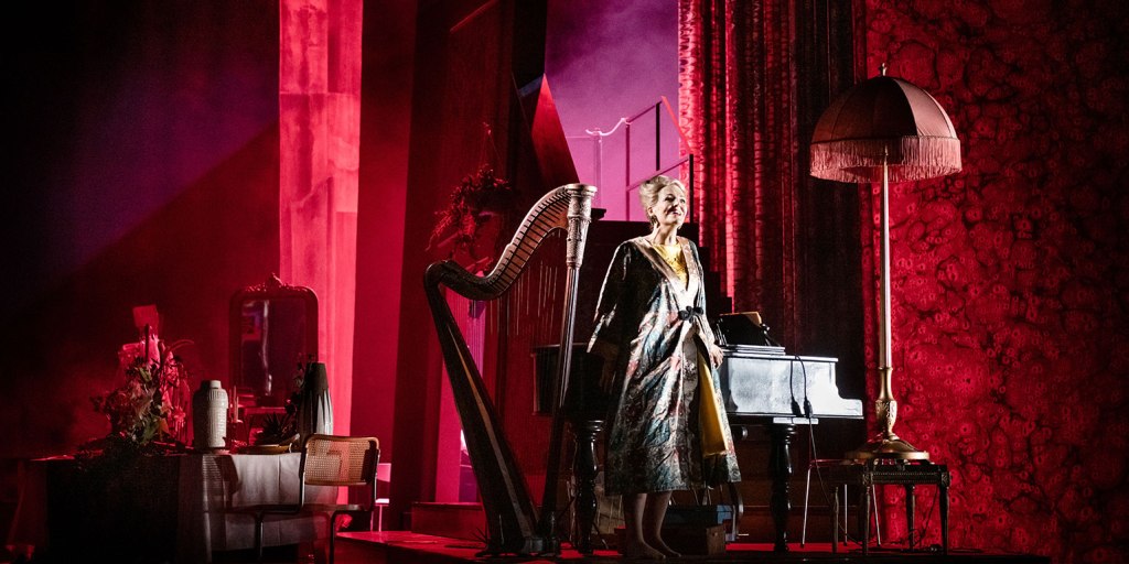 Con curiosità si ritorna a vedere Prima Donna ora in scena a Stoccolma. La produzione ungherese del 2017 non aveva molto convinto anche per la modestia della messa in scena e dell’esecuzione musicale. Qui tra gli ori del teatro reale non si è troppo badato a spese con la regia di Mårten Forslund e la ricca scenografia di Sabine Theunissen, uno squarcio di appartamento ancora lussuoso montato su una piattaforma che ruotando ci mostra nel finale i tetti di Parigi illuminati dai fuochi d’artificio del 14 Luglio mentre prima la stanza aveva perso le pareti per la scena notturna del duetto dalla Aliénor d’Aquitaine, l’opera con cui deve ritornare sulle scene Régine de Saint Laurent dopo il disastroso debutto di sei anni prima.