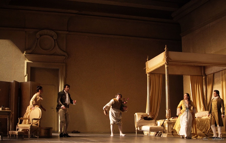 Le scene di Ezio Frigerio non hanno perso nulla della loro eleganza, i toni rosati dell’ocra dominano le prospettive degli interni e un luminosissimo giallo oro gli elegantissimi costumi della Squarciapino, mentre la regia, ripresa da Marina Bianchi, è sempre arguta, vivace, fedelissima al libretto e dai movimenti precisi come un orologio e si conferma ancora perfettamente funzionale. È piena di particolari rivelatori della cura della messa in scena: Antonio il giardiniere entra in camera scalzo (per non sporcare ha lasciato fuori gli zoccoli incrostati di fango); Cherubino esce dalla camera di Susanna vestito da uomo, non più con i vestiti da donna che gli erano stati fatti indossare (ha avuto tutto il tempo di cambiarsi); Bartolo è più che sconcertato alla notizia di essere padre di Figaro, anzi di Raffaello, e di dover sposare Marcellina…