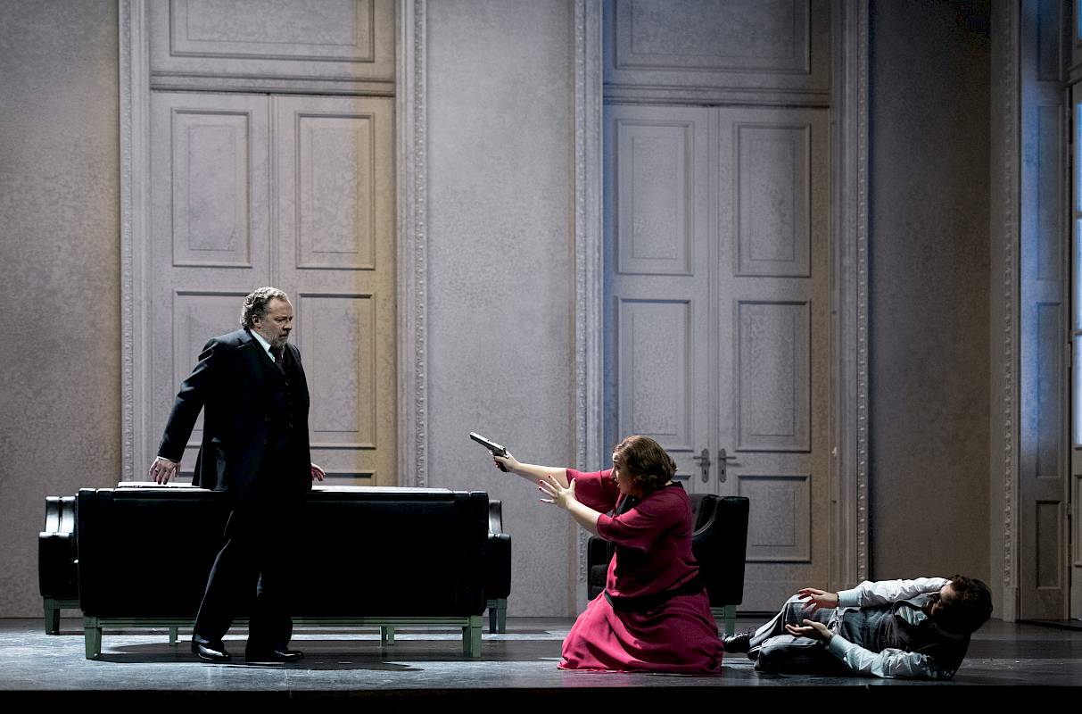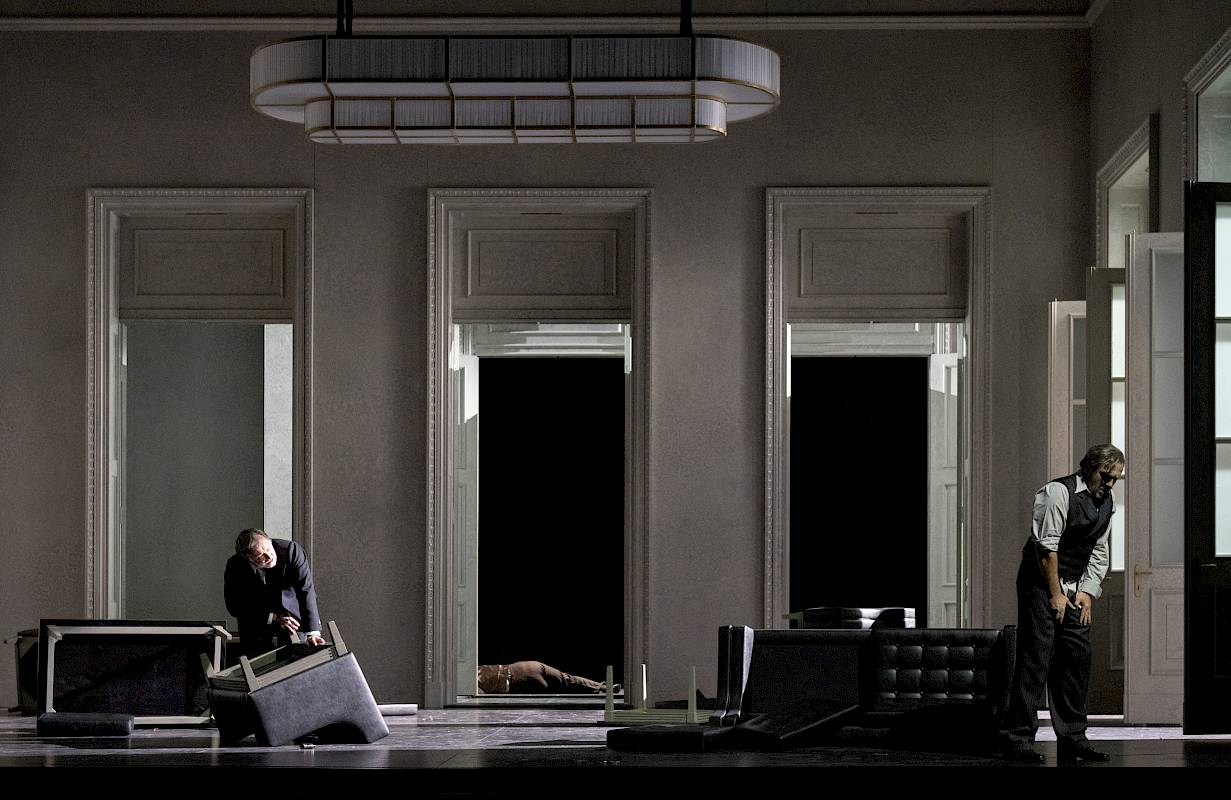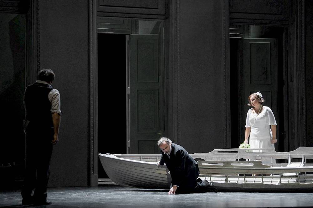 La messa in scena è di Andreas Homoki, sovrintendente del teatro, che opta per un’ambientazione nei primi decenni del XX secolo, il periodo delle dittature. Lo scavo sui personaggi è facilitato dall’assenza delle masse e da una struttura scenografica, di Christian Schmidt, che ne esalta la psicologia da topi intrappolati dal destino in un labirinto senza uscita. D’accordo che si ritrova la solita struttura rotante, ma questa rende efficace l’effetto cinematografico di percorrere i carrugi di Genova con le sue edicolette per la Madonna all’inizio e poi il dedalo di stanze dell’«atra magion», del «palagio altero» dei Fieschi, un interno grigio e solennemente opprimente. A Parigi Bieito aveva messo in scena la poppa di una nave porta container, qui Homoki si accontenta di una barca spiaggiata la cui immagine ritornerà più volte assieme all’Amelia bambina e alla donna morta al suo fianco. Qui come non mai è decisivo l’apporto del bel gioco luci di Franck Evin.