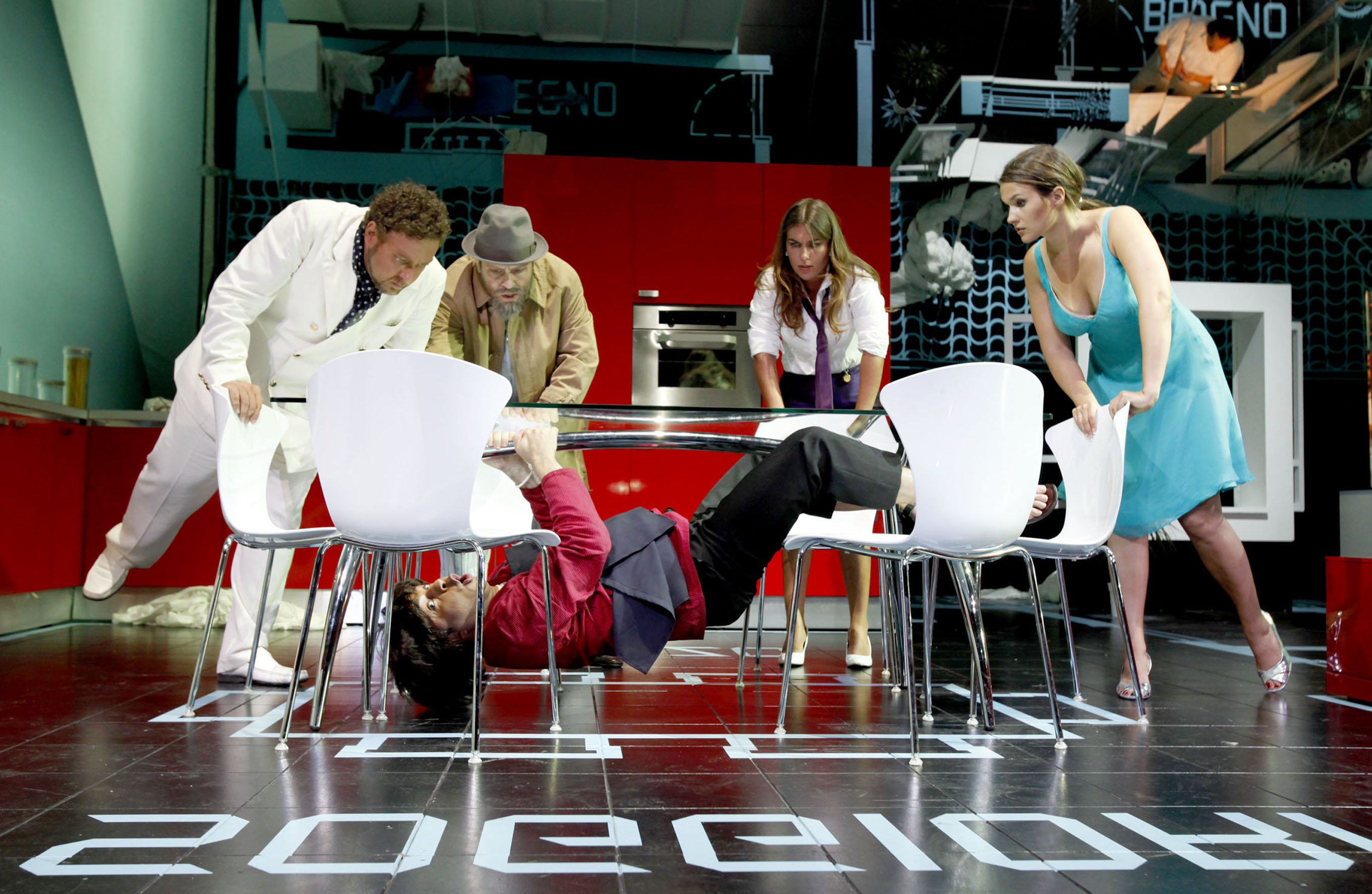 Il fedele scenografo Paolo Fantin disegna la planimetria in scala 1:1 di un alloggio (come nel film Dogville di von Trier) riflessa in uno specchio a 45° che ci mostra i personaggi dall’alto, anche quando si nascondono alla vista frontale. A sipario aperto facchini portano in scena mobili, suppellettili e su carrelli perfino i personaggi, che prendono vita con l’ultima nota dell’ouverture. I personaggi de La scala di seta non hanno spessore psicologico, ma sono perfettamente caratterizzati e qui incontrano interpreti d’eccezione. Ol’ga Peretjat’ko è una Giulia vocalmente strepitosa e di presenza scenica abbagliante; come Germano, domestico filippino con caschetto alla Mireille Mathieu che parla col pesce rosso, abbiamo Paolo Bordogna, cantante attore che conosce perfettamente i ritmi del teatro e della musica; Carlo Lepore è un gustosissimo Blansac a cui viene aggiunta «Alle voci della gloria» perché il suo personaggio non ha un pezzo solistico: un’aria e cabaletta scritta da Rossini probabilmente durante gli anni veneziani. Questo stesso numero musicale era stato inserito da Alberto Zedda nell’ Adelaide d Borgogna del 2006 e affidato al Berengario di Lorenzo Regazzo, anche lui privo di una parte solistica. José Manuel Zapata è un Dorvil un po’ sovrappeso ma vocalmente pregevole mentre Anna Malavasi è la zitella Lucilla che, meglio tardi che mai, scopre i piaceri dei sensi. Daniele Zanfardino infine l’inetto Dormont.