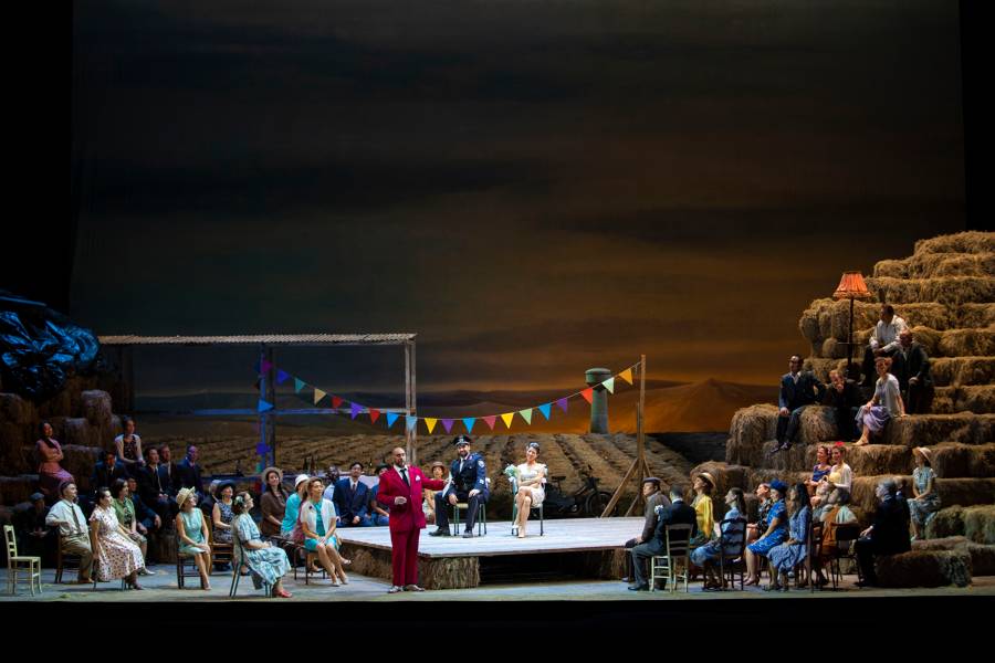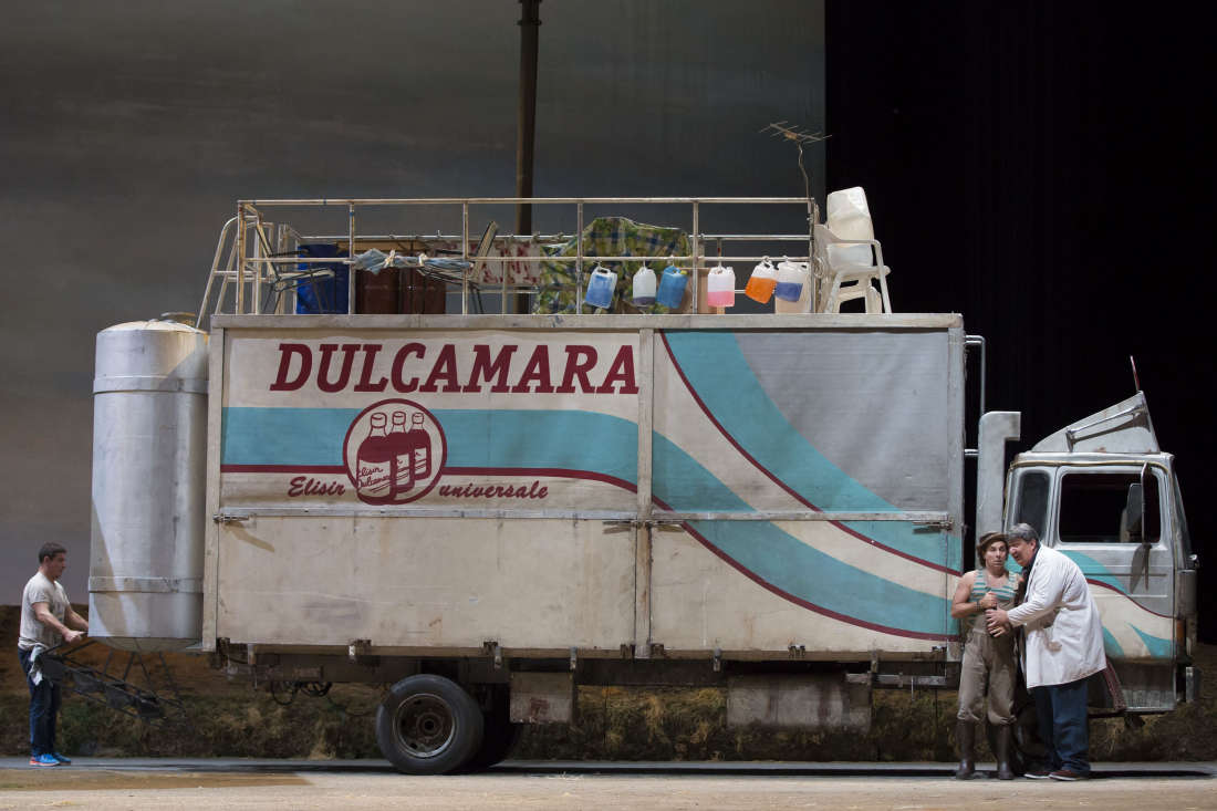 La direzione di Edward Gardner è tirata via senza partecipazione e con concertati pasticciati, come se la musica di Donizetti non meritasse di più. Invece, per fortuna, la grazia dell’opera riesce sempre a vincere con il suo mirabile equilibrio tra comico e patetico e il suo patrimonio di melodie che restano tra le più belle non solo del fecondo musicista bergamasco, ma dell’opera italiana tout court. Nella scelta delle dieci più belle opere da salvare L’elisir d’amore avrebbe certamente il suo posto assicurato. Chantal Thomas ci restituisce sulla scena i colori e la luce di un’estate della campagna padana mentre Pelly soprintende alla semplice ma schietta psicologia dei personaggi e alla vivacità delle controscene. Spiritoso il sipario con le vecchie pubblicità dei giornali adattate ai prodotti di Dulcamara.