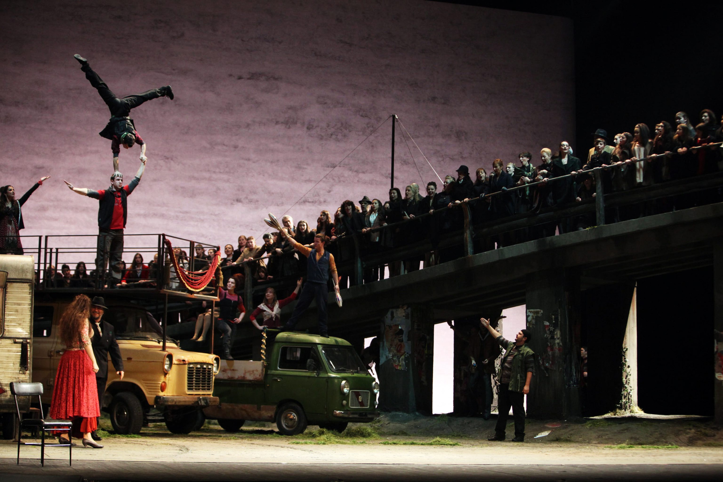 Nella regia di Martone la realtà trabocca oltre il sipario e quasi si annulla la distanza tra la scena e gli spettatori. Il palcoscenico viene stirato fino in platea da dove arrivano i contadini, Canio finisce il suo monologo quasi dentro un palco, Silvio trepida in prima fila e il pubblico della pantomima in scena è un’estensione di quello in platea, con gli stessi abiti eleganti. La scenografia di Sergio Tramonti ambienta la vicenda in una squallida periferia degradata con un lurido camper e un viadotto sotto cui delle prostitute attendono i clienti in macchina. Congrui i costumi di Ursula Patzak, con Canio in doppio petto e gioielli d’oro addosso che gli danno un’aria da pappone mentre Nedda nel teatrino ha un abito bianco il cui strascico ha raccolto il fango e lo sporco dei posti visitati.