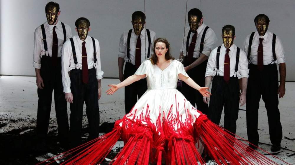 L’allestimento si basa sui colori menzionati nel testo: il bianco, il nero e il rosso. Il primo è il colore della reggia di Erode, un ambiente di un candore abbagliante nella tersa scenografia di Paolo Fantin, incorniciato da fredde luci al neon; il nero è quello della terra della prigione di Jochanaan e della Luna che scende dall’alto; il rosso ovviamente è quello del sangue di Narraboth e della testa del Battista che cola nel bacile d’argento. Il fondo della scena si apre per i ricordi d’infanzia ridestati dalla voce del Profeta o per il banchetto di Erode e non manca la cisterna circolare tagliata nel pavimento da cui emerge Jochanaan. Durante la “danza dei sette veli” la protagonista rivive il suo rapporto col padre e contemporaneamente quello probabilmente incestuoso col patrigno, impersonato da figure maschili con maschera che alla fine la vestono con un abito bianco da cui pendono lunghi fili rossi, abito che ascende al cielo. Con la morte di Jochanaan il sacrificio sarà compiuto. L’agnello sgozzato, il sangue versato dal calice, tutto rimanda alla figura del Battista. Un altro forte rimando figurativo è quello della sua testa aureolata e raggiata come nel quadro di Gustave Moreau L’apparition (1877). Ancora una volta la magia del collaudato team di Michieletto – Paolo Fantin scenografo, Alessandro Carletti luci, Carla Teti costumi – rende questo uno spettacolo visivamente coerente e intrigante.