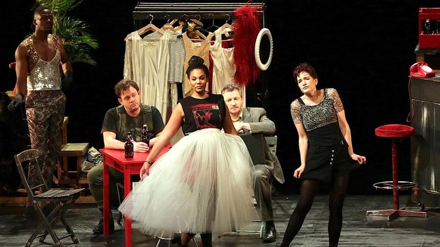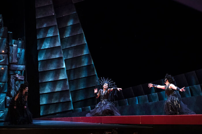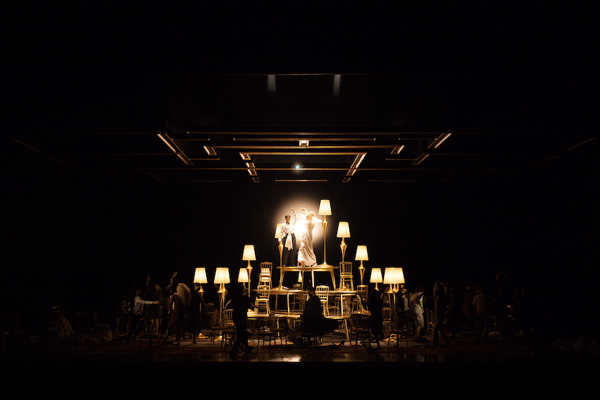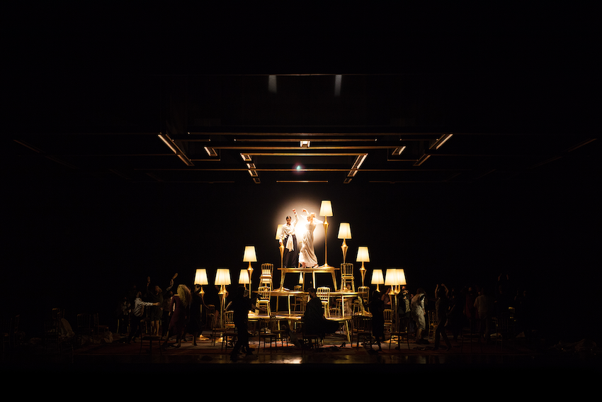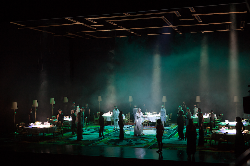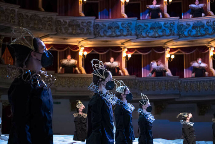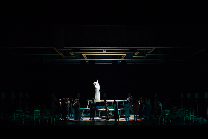 Questo aspetto “comico” non sembra essere stato preso in considerazione dal regista Àlex Ollé de La Fura dels Baus che invece considera il lavoro un inno alla liberazione e alla scoperta della verità, come afferma in un’intervista. La scenografia di Afons Flores copia il labirinto che cala dall’alto della produzione di Stefano Poda, che comunque non influisce molto sulla drammaturgia e rimane appena discernibile nell’oscurità che non rende facile la ripresa dello streaming. Le diverse porte sono risolte con un fascio di luce di colore e l’ultima si apre sul salone in cui si svolge la festa di nozze con le altre mogli tra gli invitati. I tavoli saranno poi impilati a piramide, una barricata in verticale, per il tentativo di fuga (verso il soffitto?) delle donne capeggiate da Ariane. Il terzo atto è dominato da una grande cornice, lo specchio di un bagno per signore ed è dalle quinte che Ariane e la nutrice si allontaneranno, lasciando le altre donne avanzare verso il proscenio con il marito ancora legato alla sedia.Il realismo che vediamo in scena non risolve certo il simbolismo del lavoro e il lungo intervento prima dell’inizio dello spettacolo di due membri di un collettivo che rivendica l’occupazione del teatro non ha aiutato a entrare nell’atmosfera.