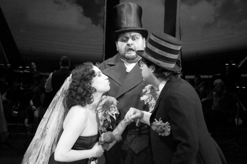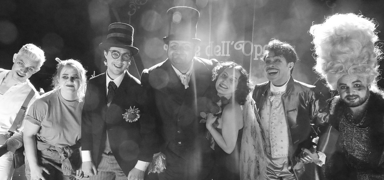 Marcus H. Rosenmüller, regista di cinema e documentarista televisione, che aveva qui prodotto sette anni fa un Comte Ory, fa diventare Il signor Bruschino un film in bianco e nero, una vecchia pellicola rigata dal tempo in cui le inquadrature hanno un taglio cinematografico. La vicenda è ambientata in un teatro dove Sofia è una sarta e Florville il custode, con l’orchestra sul palcoscenico davanti a uno schermo e i cantanti agiscono al proscenio con pochi mezzi scenografici a disposizione. Dirige l’orchestra del teatro in formazione ridotta – flauto, due oboi, clarinetto, fagotto, due corni, archi e basso continuo al pianoforte per i recitativi secchi – Antonino Fogliani, un esperto di questo repertorio che infatti mette abilmente in risalto i frutti del precoce genio rossiniano, qui otto numeri musicali preceduti dalla famosa sinfonia con gli archetti dei violini che battono sui leggii.