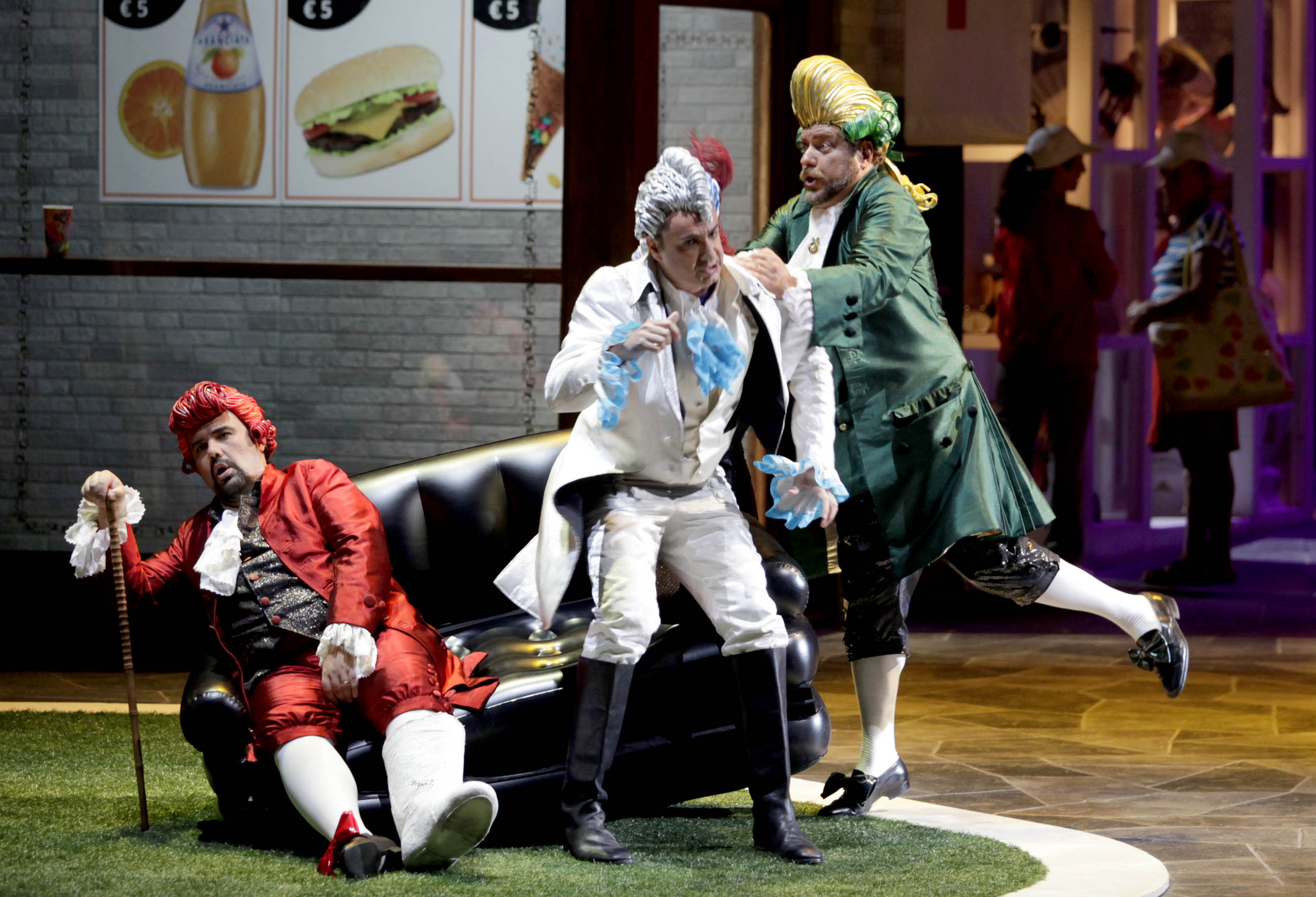 L’orchestra è sul palcoscenico del teatrino di corte. Sotto la “direzione” del baritono Alberto Rinaldi, dai tempi comici perfetti, gli orchestrali della Sonfonieorchester des Südwestrundfunks in parrucche e abiti settecenteschi ma strumenti moderni suonano e recitano la loro parte con gusto. Li aveva sapientemente concertati precedentemente Gianluigi Gelmetti.