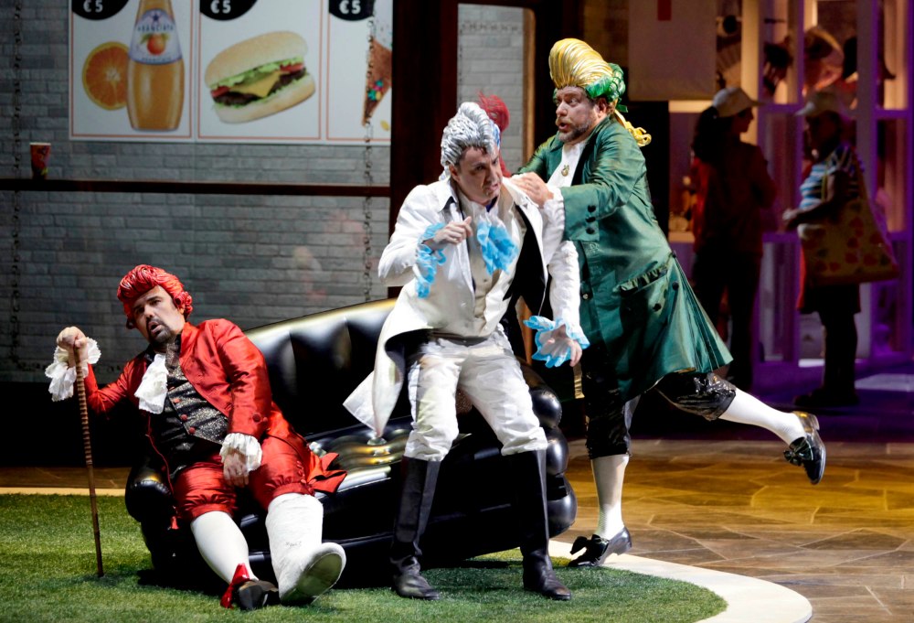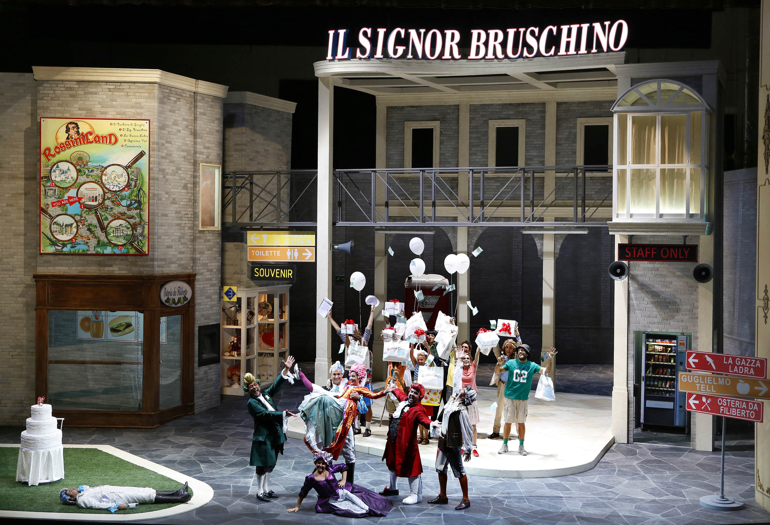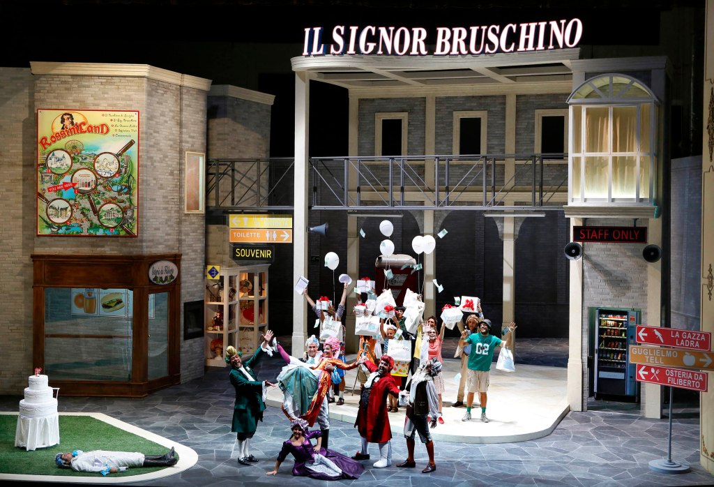 “Farsa giocosa” è definito Il signor Bruschino e stavolta la denominazione è azzeccata per la strampalata vicenda del Foppa, resa ancor più stravagante dalla messa in scena del collettivo Teatro Sotterraneo: il sipario si apre sul padiglione “Il signor Bruschino” di RossiniLand, un parco divertimenti dedicato al sommo pesarese. Figuranti un po’ svogliati e dai costumi ironici si preparano a rivivere la vicenda per il pubblico domenicale di famiglie scese sull’Adriatico. Il tour include anche la visita all’ottocentesco Teatro Rossini e i turisti armati di macchina fotografica (sì, sette anni fa ancora non erano soppiantate dagli smartphone) ammirano dorature, velluti, palchi e rispettivi occupanti. Arguta e divertente la regia dà pepe a questa operina dal ritmo scorrevole.