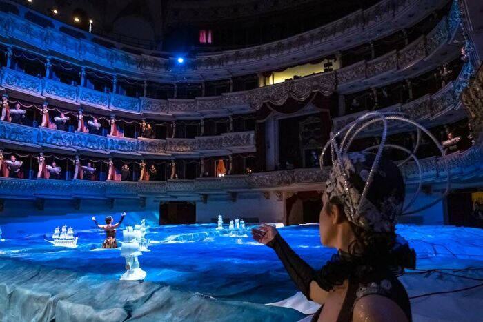 Monti firma anche scene e costumi di questo allestimento che arriva da Modena e che è stato adattato alle nuove esigenze sanitarie. Le poltrone sono impacchettate alla Christo e modellini di navi poggiate sulla tela macchiata di azzurro trasformano la platea nel mare su cui si avventura Enea per fondare un impero ma abbandonando la sua Didone. I coristi sono distribuiti nel palchi, i cantanti sono a debita distanza (e non per l’imposizione degli dèi…) così come gli orchestrali nella buca allargata e alzata a livello del pavimento della platea.