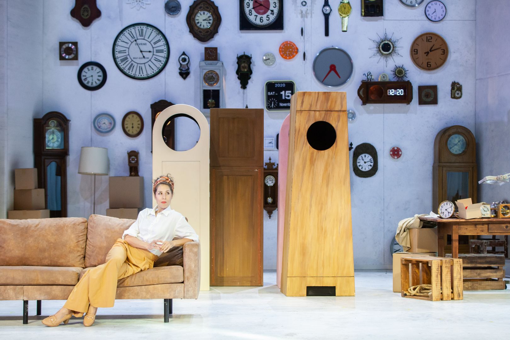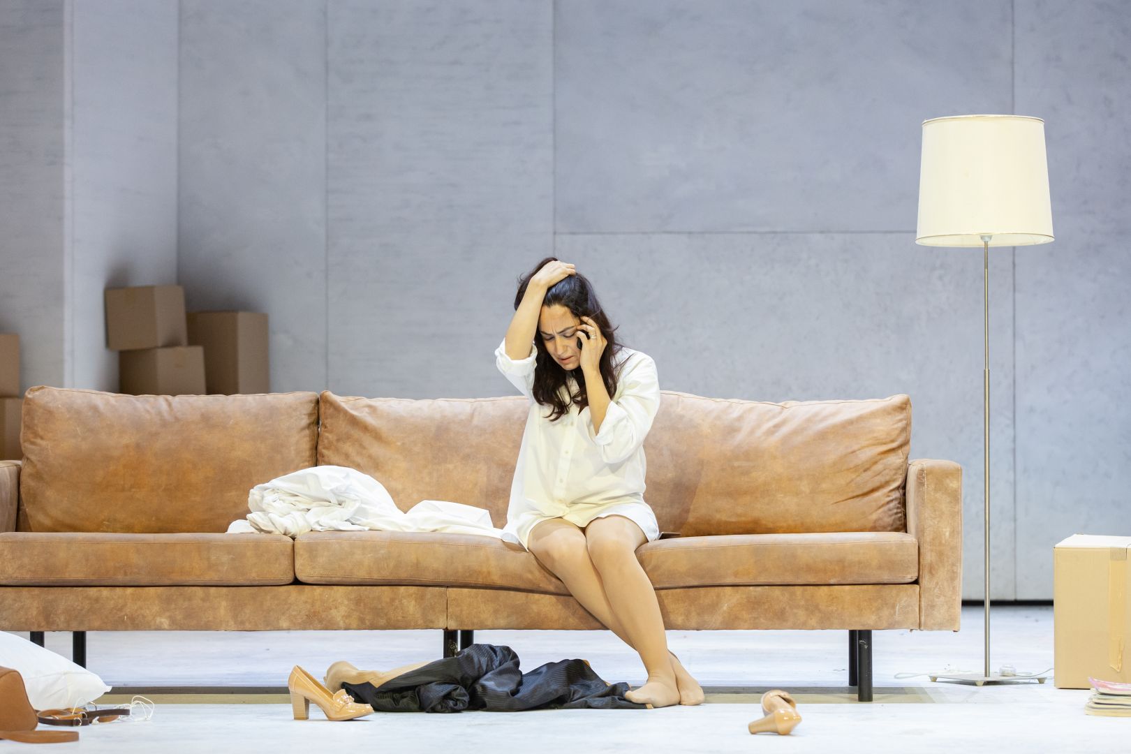 Il dramma di Cocteau è ambientato in una stanza quasi vuota dove scatoloni di cartone suggeriscono un trasloco appena avvenuto o imminente. Regia, scene e costumi, tutto al femminile: Béatrice Lachaussée, Amber Vandenhoeck, Jorine van Beek rispettivamente. L’epoca è quella contemporanea: il telefono è un cellulare e non c’è la telefonista ma la solita chiamata dal call center che ti propone un nuovo abbonamento. In camicia da uomo e scalza Lei guarda ogni tanto l’anello che Lui le ha regalato. La ripresa è cinematografica, primi piani e una macchina da presa che tallona la donna nel suo muoversi nervosamentenella stanza alla ricerca di campo. Lentamente scende la sera: le ombre si fanno più nette, le luci più bluastre, i vetri della finestra si rigano di pioggia per poi tingersi del nero della notte. Elle è il soprano siriano-armeno Talar Dekrmanjian che ha un timbro leggermente acido ma dimostra buone capacità interpretative e un’intensa presenza scenica.
