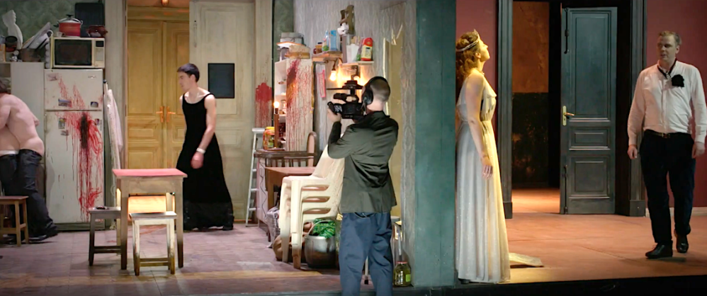 Attraverso una cornice con specchio passiamo in un alloggio fatiscente popolato da una folla di strani personaggi che entrano ed escono in continuazione dalle porte che la donna dovrebbe aprire, così che le camere misteriose risultano essere quelle che abbiamo appena visto… Riprese da un operatore alla steadicam le immagini sono proiettate in alto su uno schermo (che novità…) mentre l’impianto scenografico di Daniel Zholdak consiste nella solita immancabile piattaforma che ruotando ci mostra i vari ambienti, uno più disgustoso dell’altro, di questa dimora infestata da ossessioni sessuali e crudeltà assortite: dal sadismo alla coprofilia, dalla sodomia all’esibizionismo all’autoerotismo, tutto è reso esplicito tanto quanto è reticente il testo di Balász e misteriosa la musica di Bartók. Per di più quello che viene mostrato non ha nulla a che vedere con quello che viene detto, gli interpreti potrebbero cantare qualunque altra cosa e il risultato non cambierebbe. Che l’opera di Bartók abbia un’indubbia componente psicanalitica non è una novità e lo dimostrano diversi recenti allestimenti, ma qui l’atmosfera onirica si tinge di splatter e di porno gratuito. Il regista sembra voler mettere a prova la pazienza dello spettatore, e ci riesce. Buon per lui che in teatro non ci sia il pubblico.