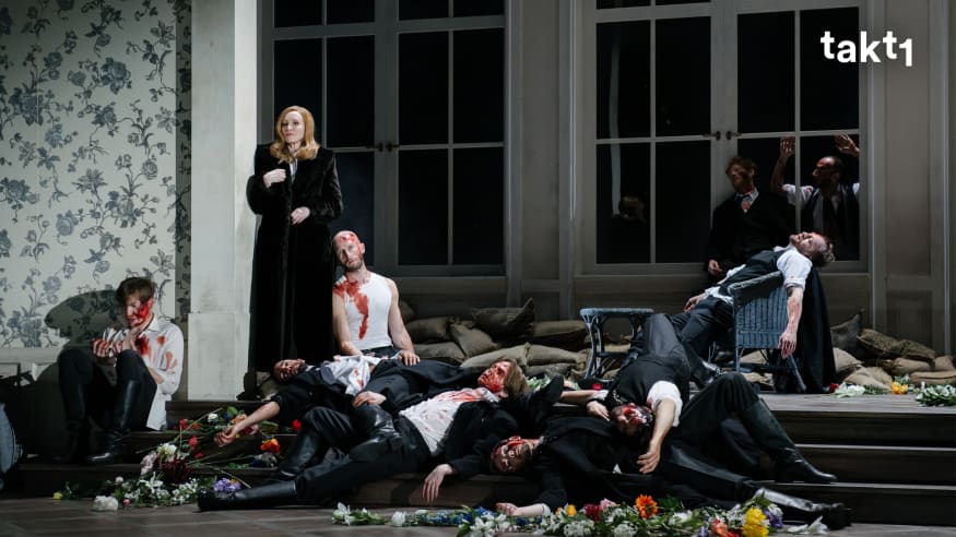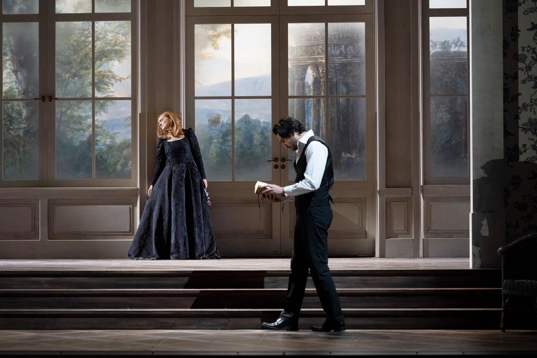 Come per l’opera di Korngold, anche qui Loy sceglie un’ambientazione moderna e borghese: la scenografia di Johannes Leiacker mostra un interno dove una parete tappezzata si apre in una specie di veranda i cui finestroni danno su un paesaggio romantico che è l’esatta replica del quadro di Claude Lorrain L’aube ora all’Hermitage. Nettamente distinti i costumi di Klaus Bruns: nero elegante per Francesca, bianco per le sue donne, completo nero e camicia bianca per gli uomini. Sempre molto curato l’aspetto attoriale, come è costume negli allestimenti di Christof Loy, ma un grosso errore è far baciare al primo incontro i due protagonisti, prima ancora che si parlino. Un gesto incongruo in tutti i sensi che toglie pathos al rapporto fra i due cognati. Magnificamente reso era stato invece il momento dell’arrivo di Paolo, così come lo sarà quello del loro furioso amplesso, anche se turbato da una lampo che si inceppa e lascia la donna infagottata nella sua ampia gonna invece che in sottoveste come risulta nelle foto della prova generale.