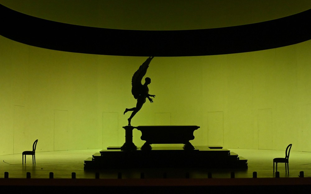 Richard Hudson, autore anche dei costumi, costruisce una scena a semicerchio che delimita un vuoto al cui centro si erge il nero monumento funebre di Gustavo III sormontato da un angelo della morte con le ali spiegate. In alto, in una specie di galleria, il coro. Inizia con il funerale del re infatti quella che altro non è che una corsa verso la fine, più volte annunciata, del monarca, dove l’amore è impossibile, la visione è cupa, lugubre, sottolineata dalle fredde luci di Giuseppe di Iorio, fredde anche quando si passa dal verde al giallo al rosso. Una moltitudine di figuranti abita questa corte frivola e disperata che cerca invano un appagamento nell’eros per esorcizzare l’ombra della morte. L’atmosfera da fassbinderiano Querelle de Brest continua nel postribolo gestito da Ulrica, dove neanche i rigidi congiurati, qui Ribbing e Dehorn, il primo baffuto come Vittorio Emanuele II, disdegnano la marchetta di un marinaretto.
