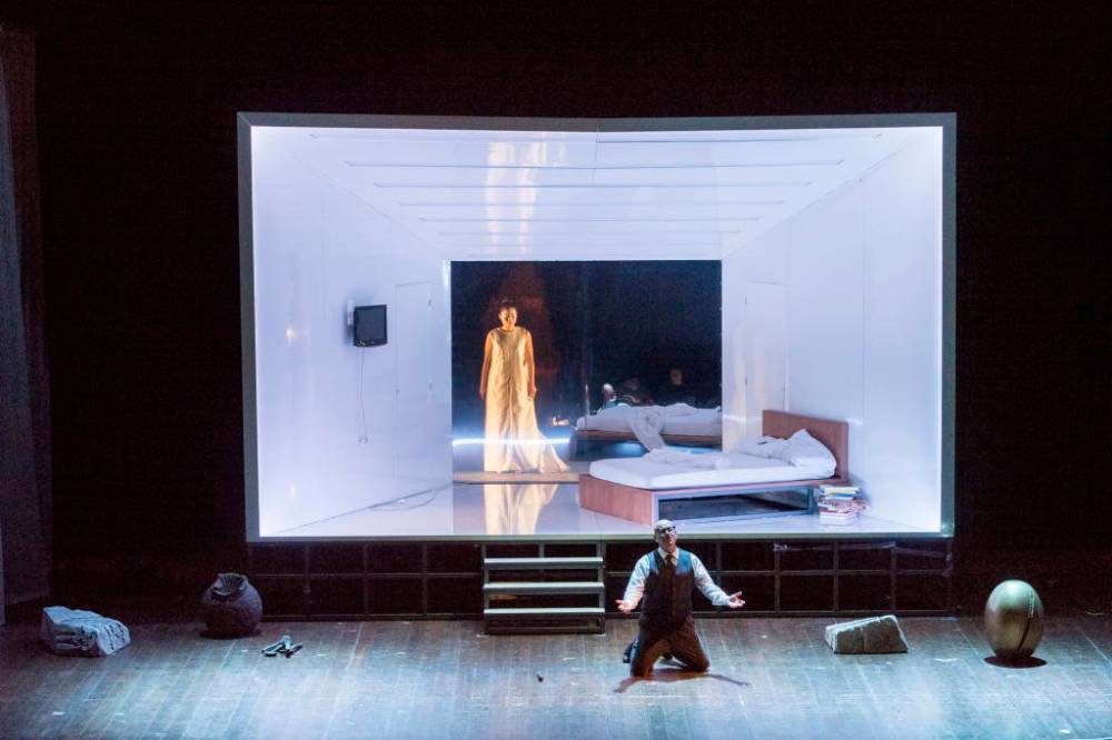 La messa in scena è affidata al direttore artistico del festival Francesco Micheli, che ha realizzato uno spettacolo intelligentemente provocatore nella sua scelta di rappresentare la vicenda mitologica in un’ambientazione borghese degli anni ’70, con le sagome degli edifici popolari del quartiere Monterosso di Bergamo che si riflettono nelle pozzanghere nella scenografia di Edoardo Sanchi. Quattro pedane scendono dall’alto per fornire la cucina, il salotto e le camere da letto delle due coppie. L’arredamento è nello stile dell’epoca con i caratteristici tessuti stampati delle lenzuola e della tovaglia – quest’ultima, ritagliata e cucita, diventa la veste che ucciderà Creusa.