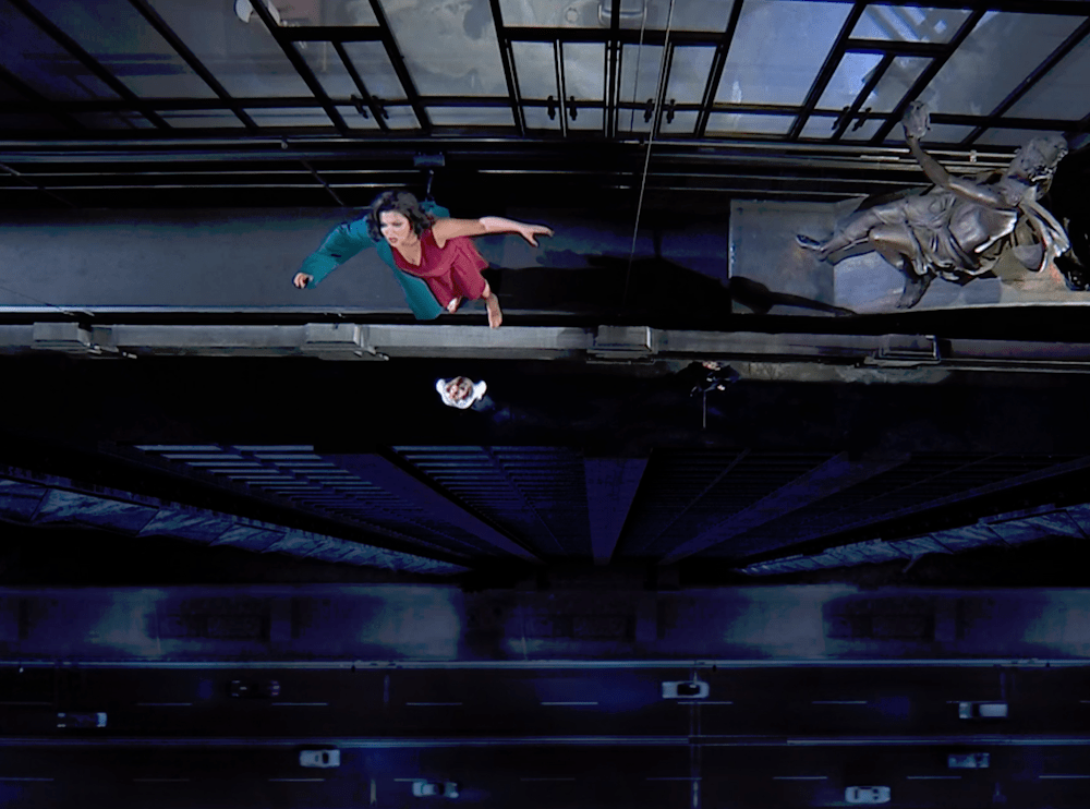L’ipertecnologico spettacolo di Livermore ha una doppia fruizione: a teatro e sul piccolo schermo. Sono quasi due spettacoli diversi quelli che vedono gli spettatori della Scala e quelli della diretta televisiva: non si tratta solo di primi piani o taglio delle inquadrature, ci sono momenti che solo sullo schermo televisivo possono essere ammirati, quali le riprese dentro l’automobile o quelle nell’ascensore – in cui i due coniugi hanno un furioso amplesso. O la visione dall’alto della Lady sul cornicione del grattacielo con la vista del traffico stradale cinquanta piani più in basso, un’inquadratura che abbiamo visto innumerevoli volte al cinema, ma che qui desta meraviglia. O ancora, le immagini della festa che i telespettatori vedono svolgersi agli ultimi piani della Scottish Court Tower inquadrata a distanza, e qui il richiamo è a Blade Runner.