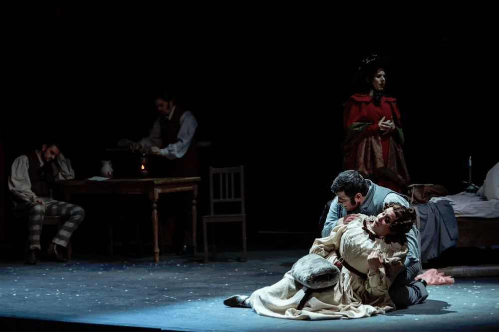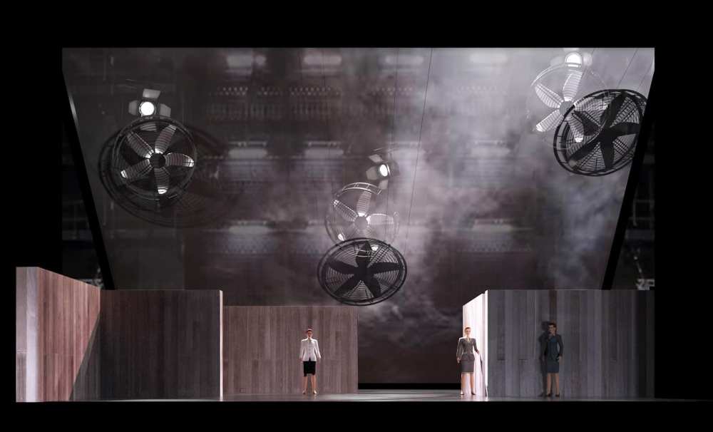 Se qualche perplessità può essere espressa da quanto viene ascoltato, nulla si può dire invece per la parte visiva dello spettacolo, affidata al veneziano d.o.c. Damiano Michieletto di cui poche ora prima si è ammirato, fino quasi a cadere nel deliquio, l’installazione immersiva “Archèus. Labirinto Mozart” al Forte Marghera, di cui si riferisce a parte. Come là, è la realizzazione scenica quella che più colpisce anche ne Le baruffe. Paolo Fantin ha tradotto il tono e l’atmosfera della commedia goldoniana ideando un insieme di cinque «macchine emotive o dell’inquietudine», come le ha volute definire lui: la prima è il teatro stesso nella sua nudità; la seconda è il vento, lo scirocco che infiamma gli animi, concretizzato da tre grandi pale di ventilatori; la terza è il legno delle strutture che definiscono i diversi ambienti, un legno corroso dall’acqua e dal sale come quello delle barche o delle bricole che punteggiano la laguna, strutture che vengono distrutte per fornire le “armi” a questi poveri belligeranti, le assi, e il rumore fragoroso di quando queste si abbattono a terra; la quarta è la nebbia della laguna, con le macchine dei fumi, le ombre; la quinta è la luce, magnificamente ricreata da Alessandro Carletti. Sergio Metalli si occupa delle atmosferiche proiezioni video mentre Carla Teti provvede i come sempre perfetti costumi, qui settecenteschi ma logori e declinati nelle mille tonalità del grigio sporcato d’azzurro, verde o terra. Il gioco di pieni e di vuoti in scena, il movimento delle masse e la recitazione attoriale dei singoli sono gestiti in maniera magistrale da Michieletto che firma uno spettacolo più scarno del solito, ma sempre coinvolgente.