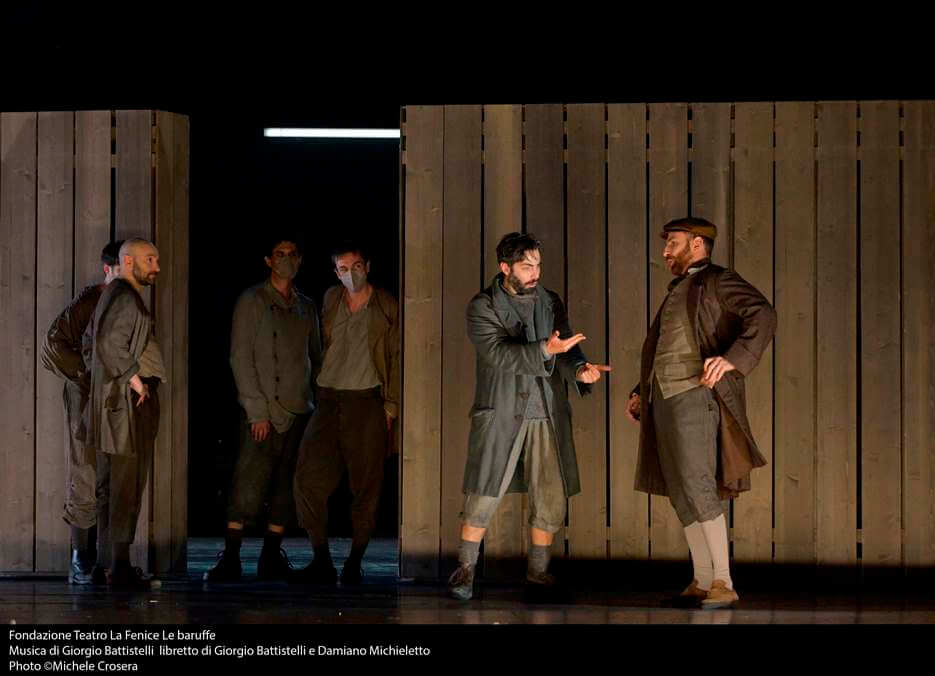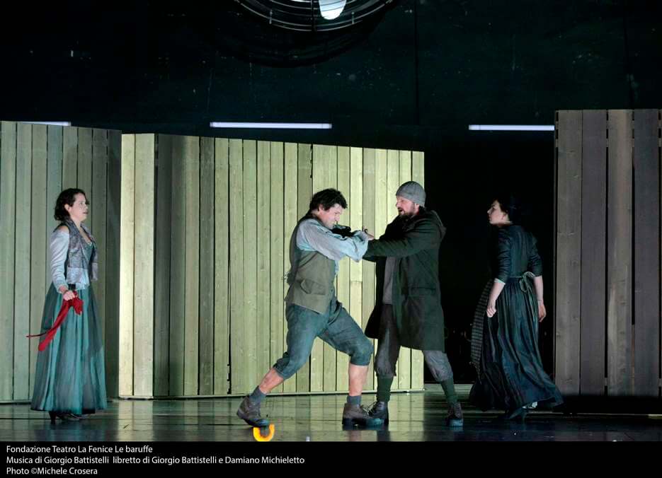 La composizione di Battistelli vede la luce in prima mondiale al Teatro la Fenice in occasione del 60° anniversario della casa editrice veneziana Marsilio che cura l’edizione nazionale dei lavori di Goldoni. La sua 35esima composizione per il teatro conferma lo stile compositivo già espresso nelle precedenti ultime opere Richard III, Co2 e Julius Caesar, tutte contrassegnate da un raffinato disegno orchestrale e un uso della strumentazione evocativo e pregnante – qui è la fisarmonica che dà il tono locale e la preponderante percussione che sottolinea i baruffanti animi e la natura inclemente. Il colore è scuro e serpeggia una tensione che si scarica in fortissimi seguiti da oasi di pace. Per la vocalità invece non si va al di là di un generico declamato ritmico che non caratterizza i personaggi, che cantano quindi tutti alla stessa maniera, soprattutto quelli femminili.