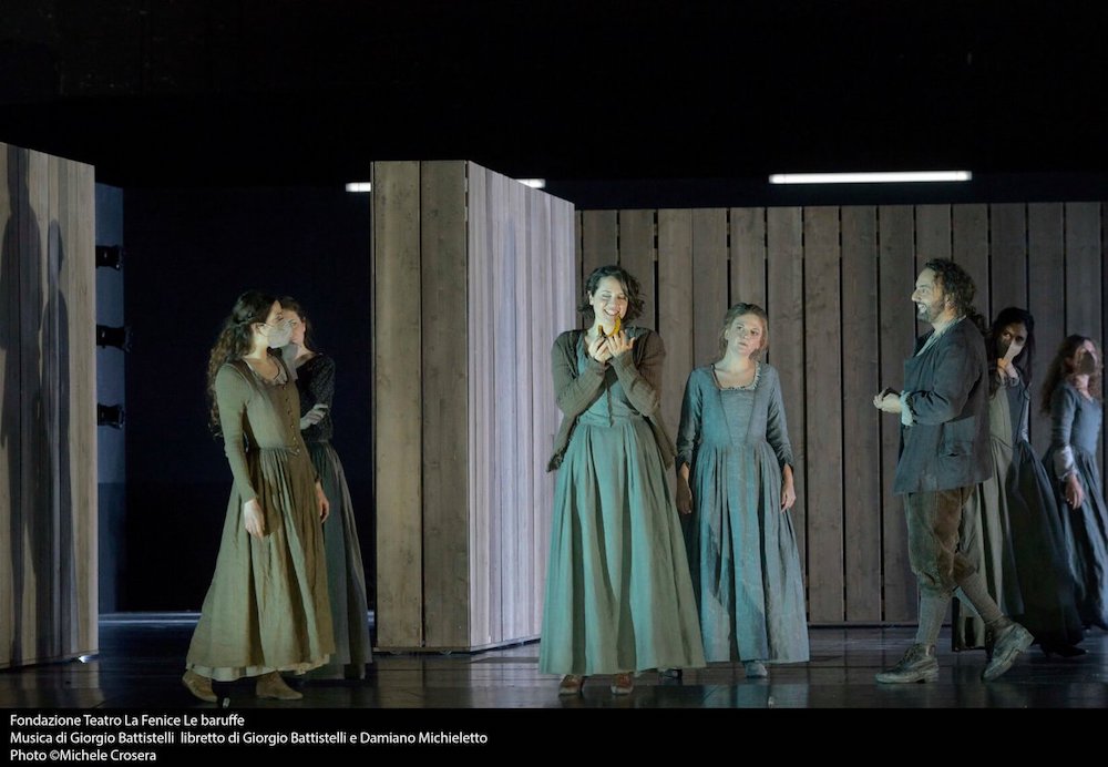 L’opera inizia con un preludio formato da un tappeto di suoni brulicanti, un rumore bianco, un fondo indistinto dalla cui nebbia emergono i fonemi del coro che elenca le cose di questa povera gente che si gioca la sopravvivenza con quanto il mare offre loro avaramente («sfoggi, barboni | boseghe, rombi | granzi, bisatti»), le verdure, i sentimenti («spàsemi, bissabuova | travaggi, stramanio | tremazzo, batticuore»), i colorati improperi, i vari tipi di imbarcazioni e il sempre presente «sirocco de sottovento». Il coro, ovviamente assente nel lavoro originale di Goldoni, qui è trattato come un’inedita installazione sonora a cui segue il grido del venditore ambulante di zucca al forno, la causa di tanto trambusto. Da questo momento inizia un concertato che senza distendersi in una linea melodica forma una rete di voci sempre al limite, con salti di registro e una foga espressiva spesso esagerata – si tratta pur sempre di «zucca barucca», non di morti tragiche o ammazzamenti… È la performance vocale femminile quella che più soffre di questa impostazione, soprattutto nei tre caratteri di Lucietta, Orsetta e Checca affidati alle voci di Francesca Sorteni, Francesca Lombardi Mazzulli e Silvia Frigato rispettivamente alle quai è richiesto di esprimersi a ringhi, a parole spezzate, con i suoni onomatopeici del dialetto chiozzotto. Più efficaci, per una volta, gli interpreti maschili dei personaggi di Padron Toni (Alessandro Luongo), Titta Nane (Enrico Casari), Beppo (Marcello Nardis), Padron Vicenzo (Pietro di Bianco), Toffolo (Leonardo Cortellazzi) e Padron Fortunato (Rocco Cavalluzzi) che «parla presto e non dice che la metà delle parole, di maniera che gli stessi suoi compatrioti lo capiscono con difficoltà», come lo descrive Goldoni. E infine Isidoro (Federico Longhi), l’unico a esprimersi in veneziano, l’outsider, il deus ex machina che risolve la litigiosa situazione combinando non due ma ben tre matrimoni in una volta sola. Tutti hanno ben meritato gli applausi del folto pubblico che ha salutato con calore questa singolare prima della stagione lirica veneziana.