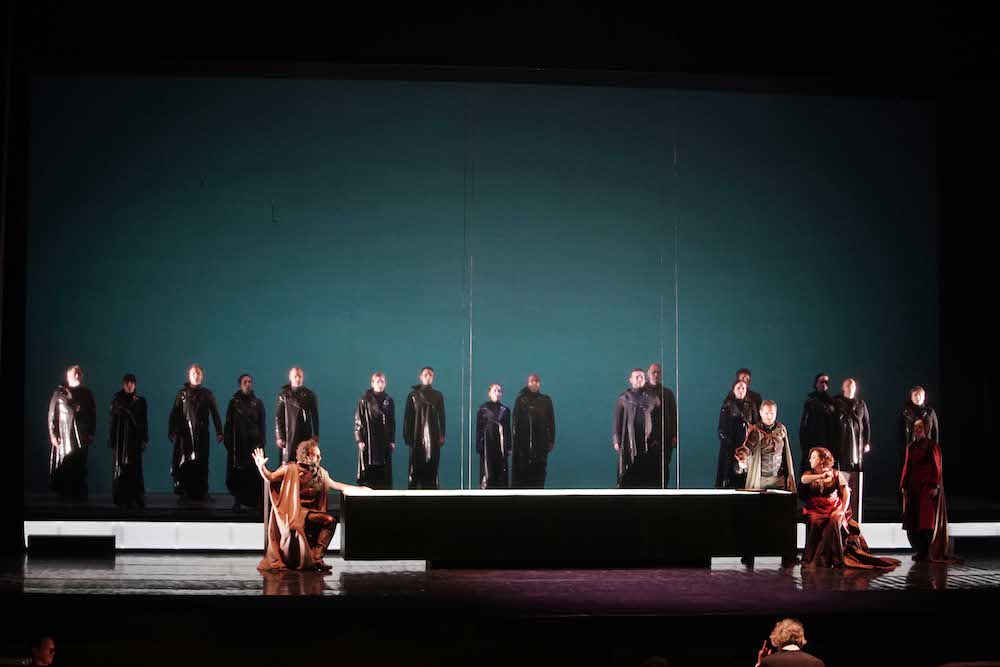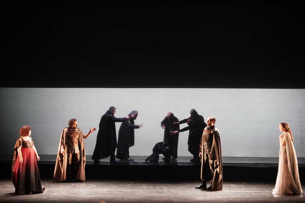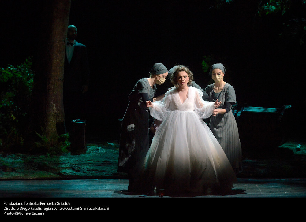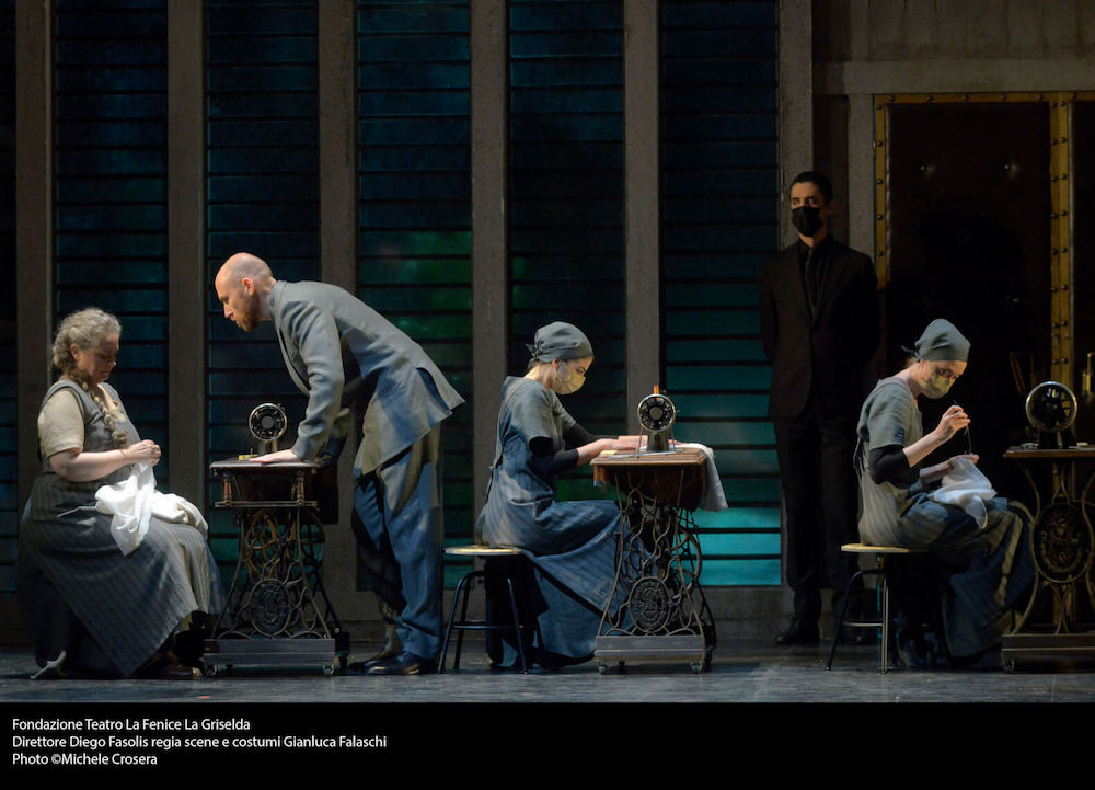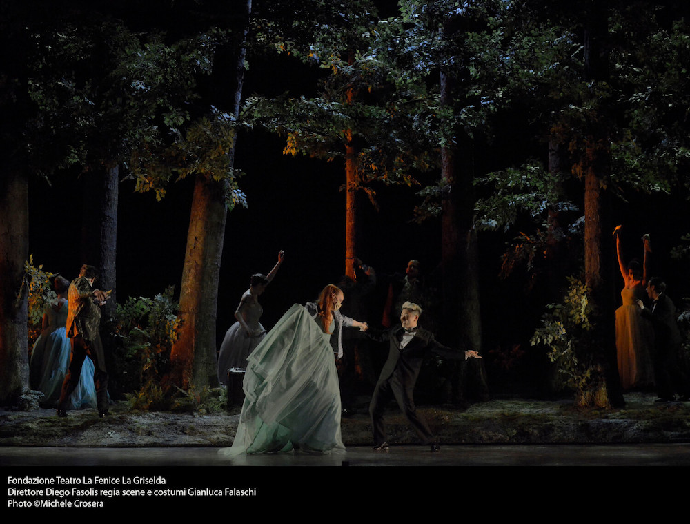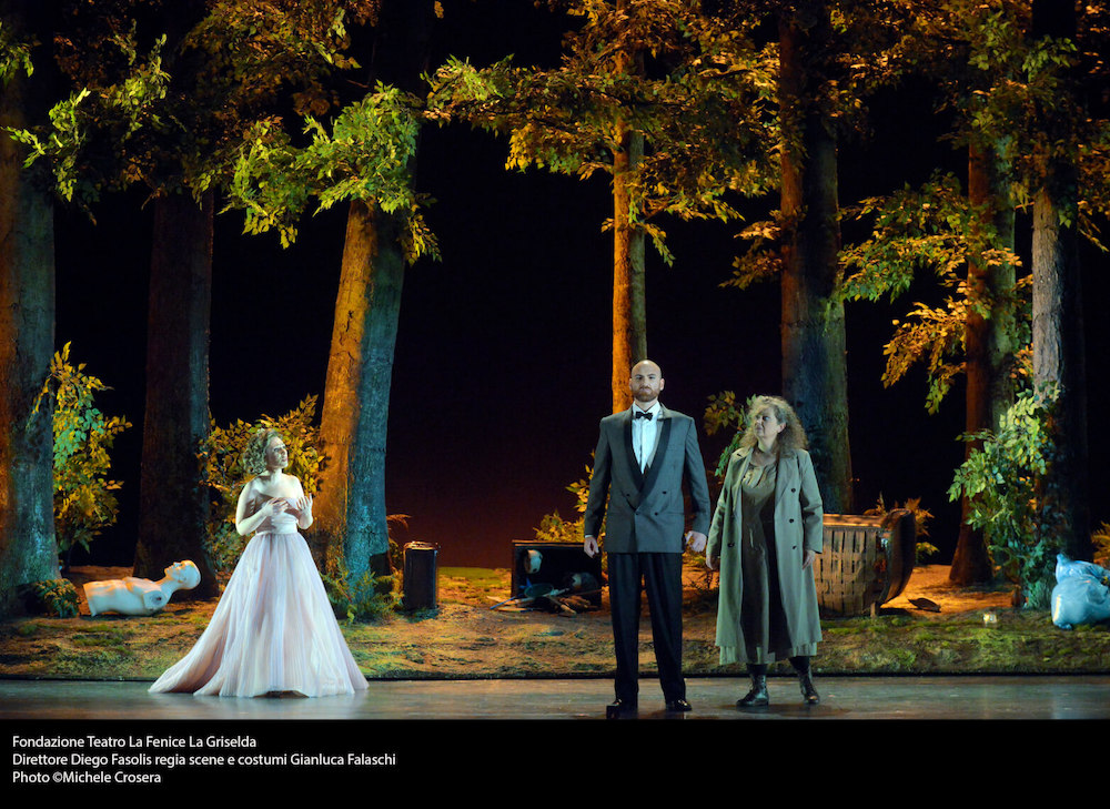 Autore della messa in scena è Gianluca Falaschi che con il disegno luci di Alessandro Carletti e Fabio Barettin e la drammaturgia di Mattia Palma firma un allestimento in cui la vicenda, ambientata in epoca moderna, vuole essere occasione per l’ennesima denuncia della sottomissione femminile al potere maschile. Vediamo infatti ad apertura di sipario una fila di macchine da cucire (strumento primario del regista/costumista!) su cui lavorano chine Griselda e altre ragazze vittime poi delle gratuite violenze dei cortigiani di Gualtiero. La mascolinità tossica e l’accettazione dei soprusi presenti nella novella trecentesca, ripresa da un librettista di inizio Settecento, rielaborata da un drammaturgo “protofemminista” come Goldoni e riletta dalla nostra sensibilità, formano l’elemento di base della lettura del regista. Totalmente condivisibile nell’idea, è la sua realizzazione che non convince pienamente. D’accordo che la foresta, elemento archetipico delle favole, «rappresenta lo spazio del pensiero di Griselda, dei suoi ricordi, lo spazio più profondo», ma qui vi si svolgerà un party e gli alberi traballeranno sotto i saltelli degli invitati ebbri, rivelando la loro provvisorietà e artificialità. La scelta registica poi è poco convincente nei confronti di alcuni personaggi, soprattutto quello di Roberto, e il pubblico infatti dimostra qualche dissenso nei confronti degli autori dell’allestimento. Applausi pienamente convinti invece per Hallenberg, Antenucci, Kim e Fasolis.