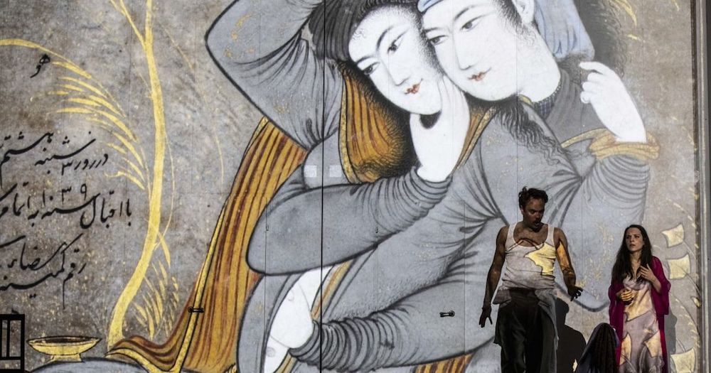 Nella messa in scena di Richard Brunel, il nuovo direttore dell’Opera di Lione, non troviamo elementi favolistici orientaleggianti: la terra e le sterpaglie del deserto contornano la scenografia di Étienne Pluss, dominata da una struttura su piattaforma girevole che rende con efficacia i vari ambienti in cui si dipana la vicenda, un’azione che procede per sguardi più che per dialoghi: il principe spia la nudità della donna, lei è stregata dal suo ritratto, il ragazzo spia i due amanti… Il testo molto poetico e letterario di Rahimi offre pochi spazi alla drammaturgia ed ecco quindi che le pareti bianche diventano schermi su cui proiettare belle immagini di miniature persiane, il ritratto fascinoso del principe, i dettagli dell’ultimo incontro e della morte degli amanti. All’inizio si era anche vista l’immagine di una donna dalle labbra cucite. Particolarmente suggestivo per le luci di Henning Streck è l’ingresso avvolto nella nebbia dello scultore Farhâd su un costone di montagna in cui è scolpito un cavallo. Appropriati si sono rivelati i costumi di Wojciech Dziedzic e le sobrie coreografie di Hervé Chaussard.