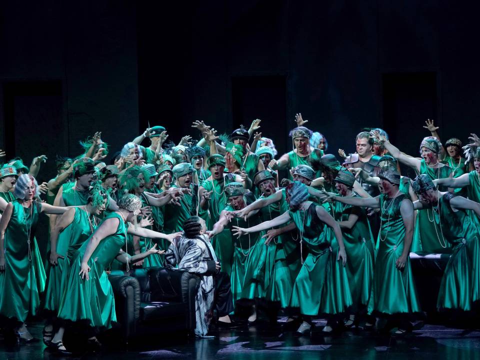 Quest’opera non vuole chiarezza: Boito con il suo libretto e con la sua musica fa una corsa sfrenata attraverso il simbolismo italiano, che vive di allusioni, misticismo e accenni enigmatici e il regista Olivier Tambosi fa di tutto per aumentare la confusione con la sua lettura da peplo horror. L’inizio sembra quello di un dramma passionale in cui le cose sono andate male e tutti, proprio tutti, hanno lo stesso abito per la costumista Gesine Völlm, ossia una vestaglia lorda di sangue, la stessa parrucca e un martello in mano, mentre Fanuèl porta una corona di spine e ha la figura del Nazareno, compreso il cuore ricamato sul petto. Nerone ha letto Freud e dopo aver portato a spasso per la scena il cadavere della madre da lui assassinata ne indossa il vestito verde. Anche il coro si esibisce in questo costume, forse un incubo dell’imperatore. Simon Mago indossa ali nere, i cristiani tuniche bianche, le cristiane sono monache. Lo scenografo Frank Philipp Schlössmann risolve il problema dei numerosi cambi di scena con una piattaforma rotante comprendente un triplice labirinto a incastro con colonne luminose che muovendosi rivelano nuovi scorci o fanno scomparire l’azione in una misteriosa oscurità grazie al gioco luci di Davy Cunnigham.