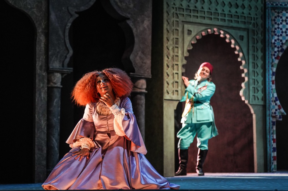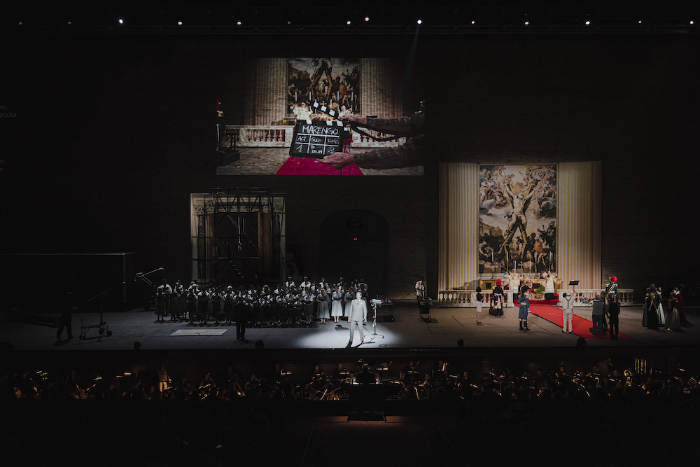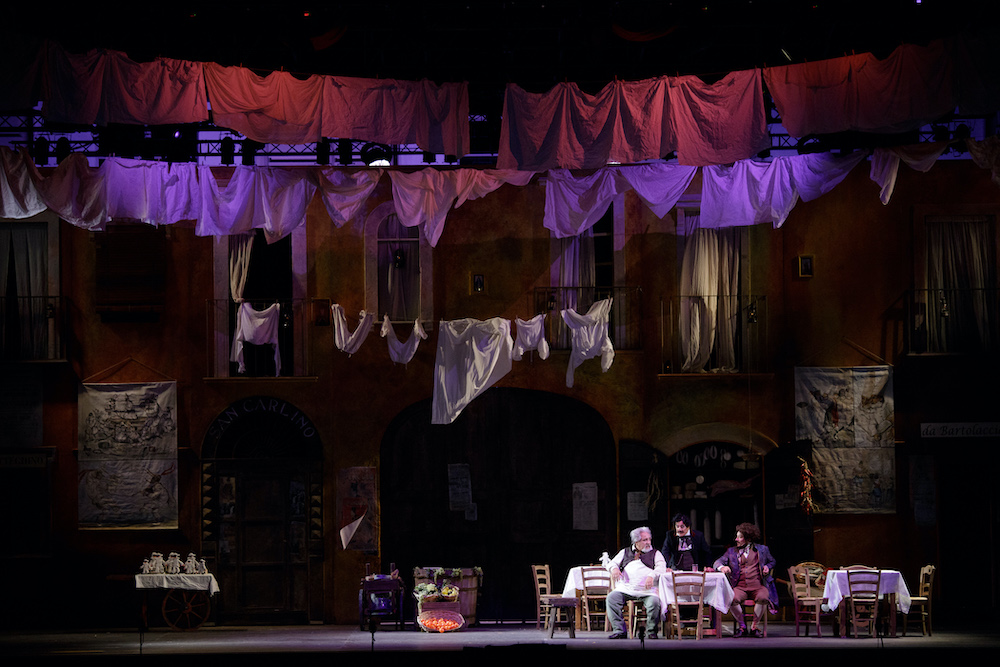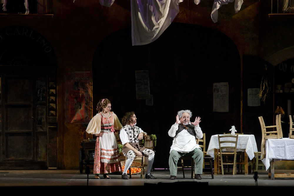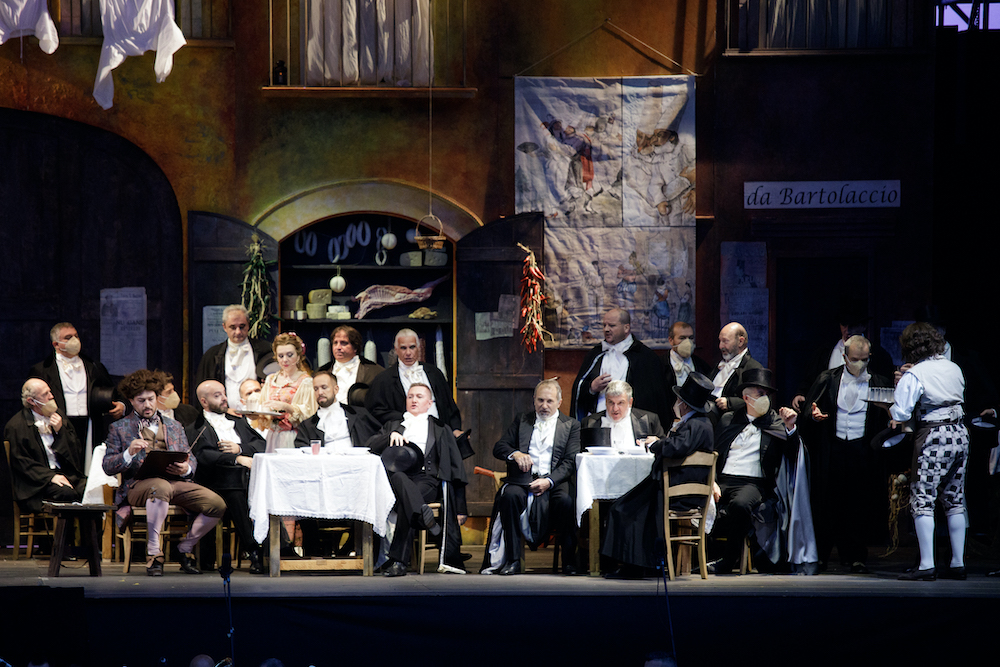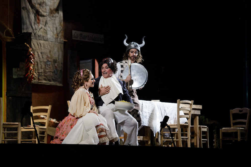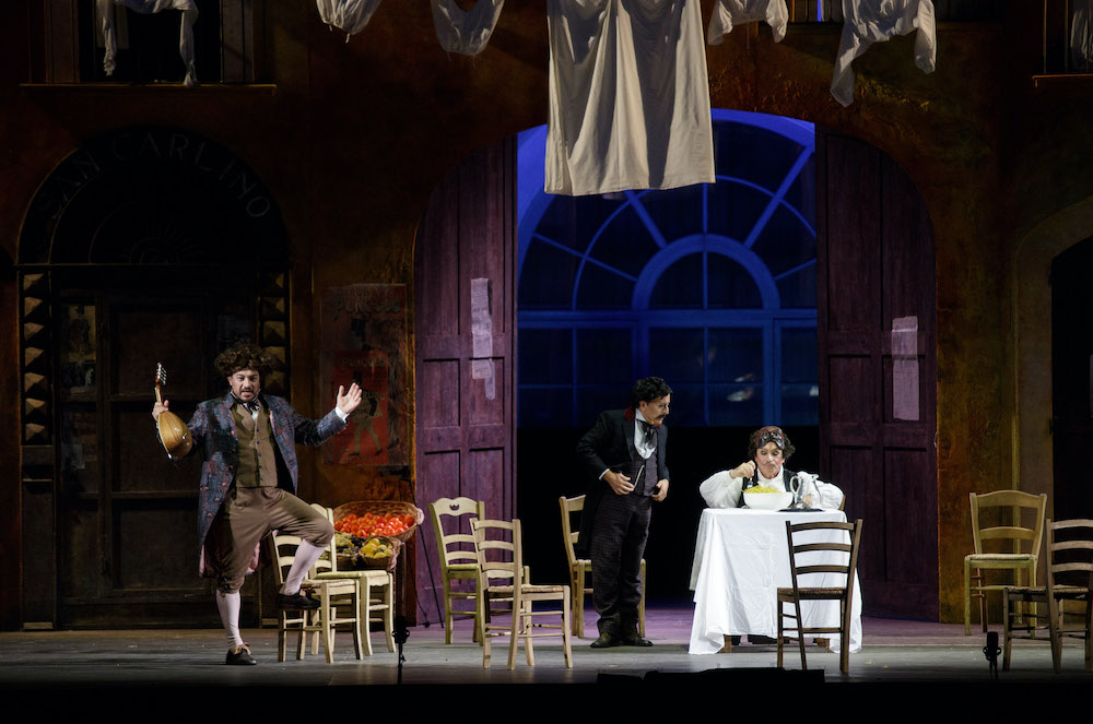 Sufficiente la performance di David Ferri Durà (Carletto), mentre di Vladimir Sazdovski (pittore Roberto alias Conte de’ Ridolfi) si nota la improbabile pronuncia del francese quando parla francese e dell’italiano quando parla italiano. Di Francesco Auriemma viene la voglia di ascoltare la profonda voce di basso in un altro ruolo meno caricaturale di questo di Succhiello Scorticone. L’attore Mario Brancaccio impersona l’irrequieto direttore di teatro. Tutti sembrano comunque divertirsi. Anche il coro, qui nei costumi di Laura Viglione che alludono alla parodia di Aida a casa di Donna Peppa con Policinella finto Aida in scena al San Carlino e a cui allude Don Mario Luzio. Chissà se il Maestro Verdi l’ha mai vista…