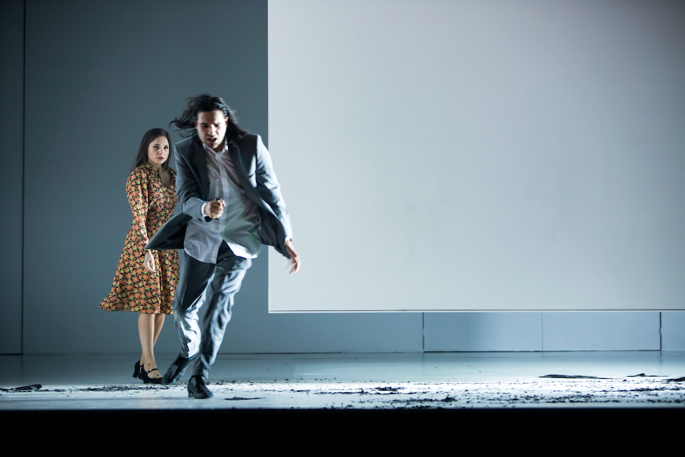 Al levarsi del sipario, dopo l’ouverture, vediamo una coppia in crisi seduta a un tavolo in abiti degli anni ’50 (costumi di Klaus Bruns). Entrambi sono nervosi, lui con una valigia pronta, che poi afferra e se ne va. Rimasta sola, sconvolta, lei si taglia le vene dei polsi. Non è il morso di un serpente a distruggere l’armonia tra Orfeo ed Euridice, ma la mancanza di comunicazione, la constatazione di non aver più nulla da dirsi, la perdita dell’amore. Nella scena seguente il coro intona il mesto «Ah! se intorno a quest’urna funesta» non in un «solitario boschetto di allori e cipressi», ma in una corsia di ospedale: Euridice è su un lettino in pericolo di vita, Orfeo chiama il suo nome e intona poi la sua prima aria rivolgendosi agli altri degenti. Nel culmine della disperazione prende la pistola di una guardia e se la punta alle tempia, ma viene fermato da Amore, un prestigiatore in cilindro e marsina piuttosto male in arnese, che gli promette di fargli ritrovare l’amata a condizione che… beh, lo sappiamo. Nel frattempo un parallelepipedo è sceso dall’alto e ha inglobato il lettino di Euridice e tutti i degenti: ora Orfeo è solo e inizia il suo viaggio nell’aldilà tra tuoni e lampi (luci bellissime come sempre quelle di Alessandro Carletti). Lo scenografo Paolo Fantin prevede ora una camera a prospettiva forzata che avanza dal fondo e le cui linee conducono a una porticina che dà su un nulla nero. In scena un grumo di figure nere e senza volto si agita minaccioso: è la «turba infernale» che impedisce il passaggio ad Orfeo. Ci vorrà il suo canto per raddolcirli: le figure nere si liberano del tessuto nero e diventano gli spiriti celesti. Orfeo cerca inutilmente tra quegli stracci l’amata, finché sul fondo si vede una larva nera che si contorce e ne escono le membra della donna. I due coniugi finalmente si ritrovano, ma l’angoscia di non poterla vedere in faccia e l’insistenza di lei per uno sguardo porta alla tragedia: inutilmente Orfeo ha cercato di bendarsi gli occhi con quegli stracci, cede e perde un’altra volta Euridice, che viene fagocitata da quella massa nera. Cambio di scena, siamo di nuovo nell’ospedale, il lettino della donna è vuoto e sono ancora i degenti ad ascoltare il lamento di Orfeo, «Che farò senza Euridice». Si ripete la scena di prima: Orfeo prende la pistola della guardia, la punta alle tempia ed è nuovamente Amore, questa volta in un completo scintillante di paillettes, a fermare il gesto e annunciargli che gli viene resa la sposa. Ma non è finita per Orfeo: durante le danze del finale altre alter ego di Euridice sembrano voler mettere alla prova il suo amore. L’ultima scena è come la prima: un tavolo, i due coniugi, la valigia, ma questa volta è l’amore che vince e i due vivranno felici e contenti, «Trionfi Amore, | e il mondo intero | serva all’impero | della beltà».