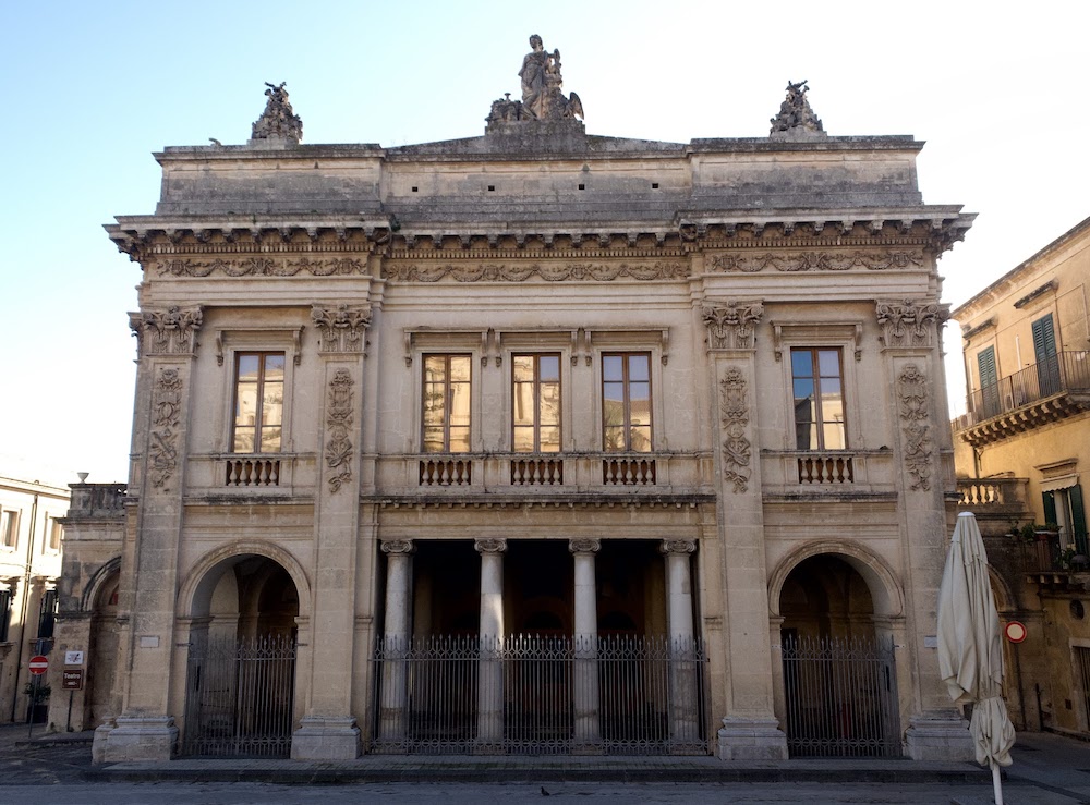 Nel 1855 la necessità di costruire un nuovo teatro si fece sentire nella cittadina siciliana e fu formato quindi un comitato di cittadini per raccogliere i fondi. Fu acquistata una abitazione (casa Salonia) nella piazza centrale e in seguito fu dato incarico all’ingegnere Francesco Sortino per disegnare il nuovo edificio. Alla sua morte nel 1863 la direzione dei lavori passò a Francesco Cassone. Nel 1864 la città di Noto s’impegno a continuare l’opera di costruzione, affidando i lavori alla ditta Ruiz di Siracusa. La costruzione tecnica e meccanica fu affidata ad alcuni cittadini di Noto sotto la guida di Fortunato Queriau, mentre la doratura del teatro fu eseguita dal pittore Santi Ferrara di Messina. La statua di arenaria, rappresentante l’allegoria della Musica, situata al centro del vestibolo del teatro è lavoro dello scultore Giuliano Palazzolo, che seguì un disegno per il Cassone; i due pittori Subba e di Stefano decorarono invece il palcoscenico.