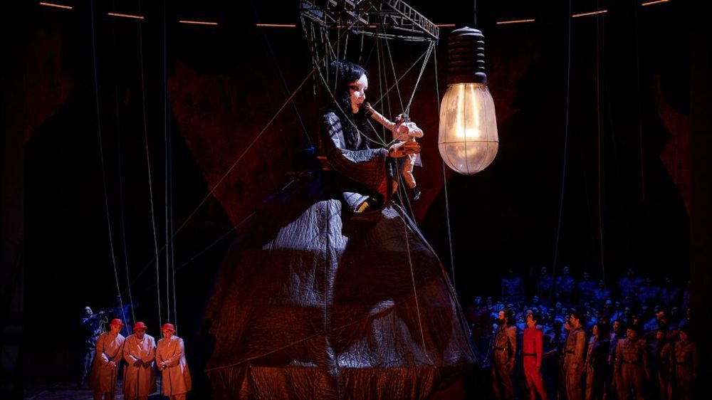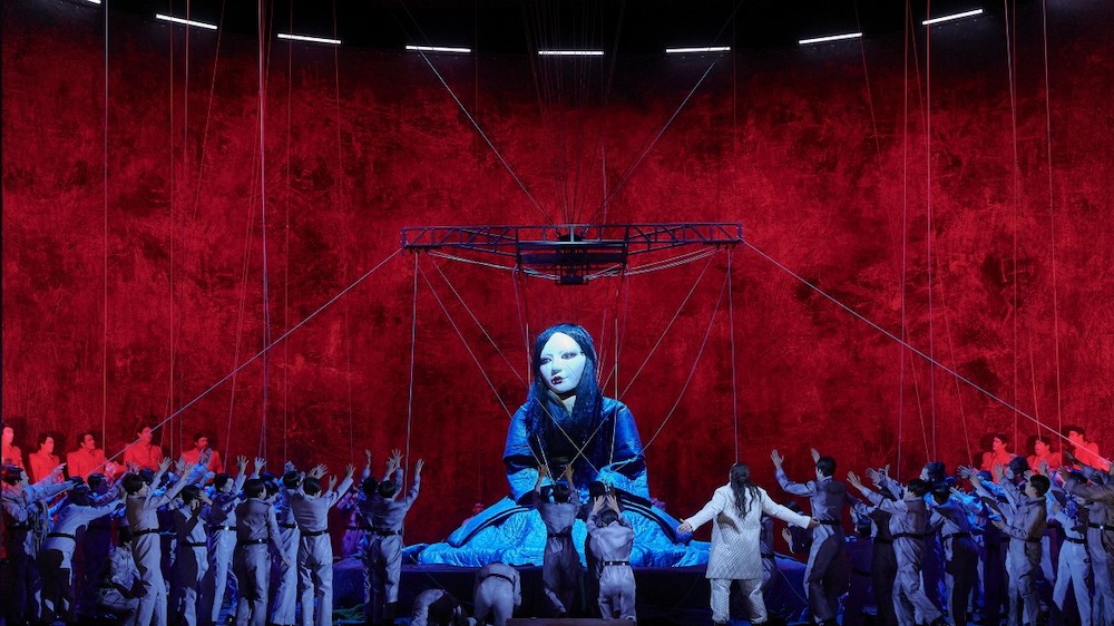 Come lo Hoffmann dei Contes di Offenbach, anche Calaf qui si innamora di una bambola, o meglio di una marionetta che ha le fattezze della principessa Turandot. Non molto diversamente da quanto aveva fatto sul palcoscenico sull’acqua di Bregenz col Rigoletto, Philipp Stölz e la scenografa Franziska Harm costruiscono una enorme figura, manovrata con fili, che ingombra quasi tutta la scena, una figura che viene fatta segno di temuta venerazione da parte del popolo: non siamo nella Cina millenaria della favola di Gozzi, ma in una dittatura orientale dove tutti portano un’uniforme grigia.