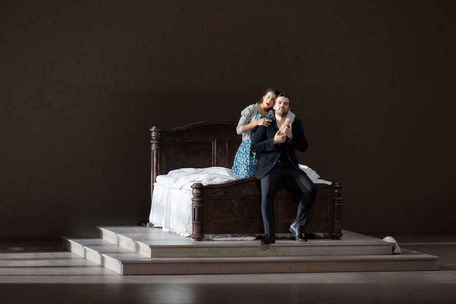 La messa in scena si deve a Christof Loy, che con le scenografie di Etienne Pluss e i costumi moderni di Barbara Drosihn crea un grande spazio vuoto che nel Gianni Schicchi ha al centro troneggiante il letto di Buoso Donati innalzato su gradini. Pochi altri elementi d’arredo denotano l’ambiente che ha a sinistra una porta e una vetrata, tanto che alla fine ai parenti non rimane quasi nulla da portar via. Loy deve aver scambiato Firenze con Napoli, poiché all’inizio vediamo i parenti consolarsi della perdita del vecchio abbuffandosi di spaghetti. Poi fortunatamente il tono è un po’ meno marcato ed è il gioco attoriale quello che si ammira di più nella sua regia, che ha tocchi arguti e ironici, ma non si discosta molto dalla solita tradizione con l’Italia caricaturale vista da uno straniero.