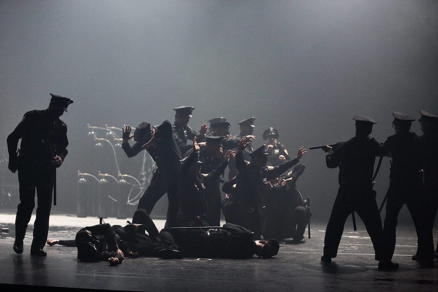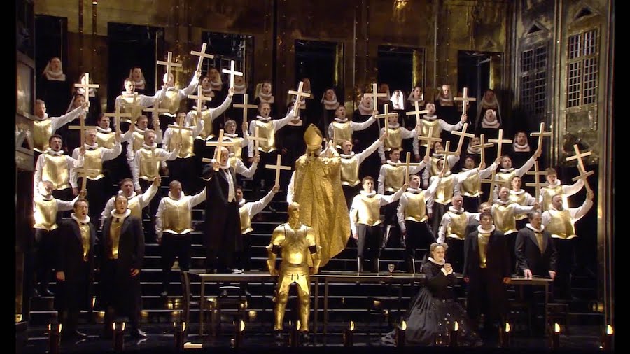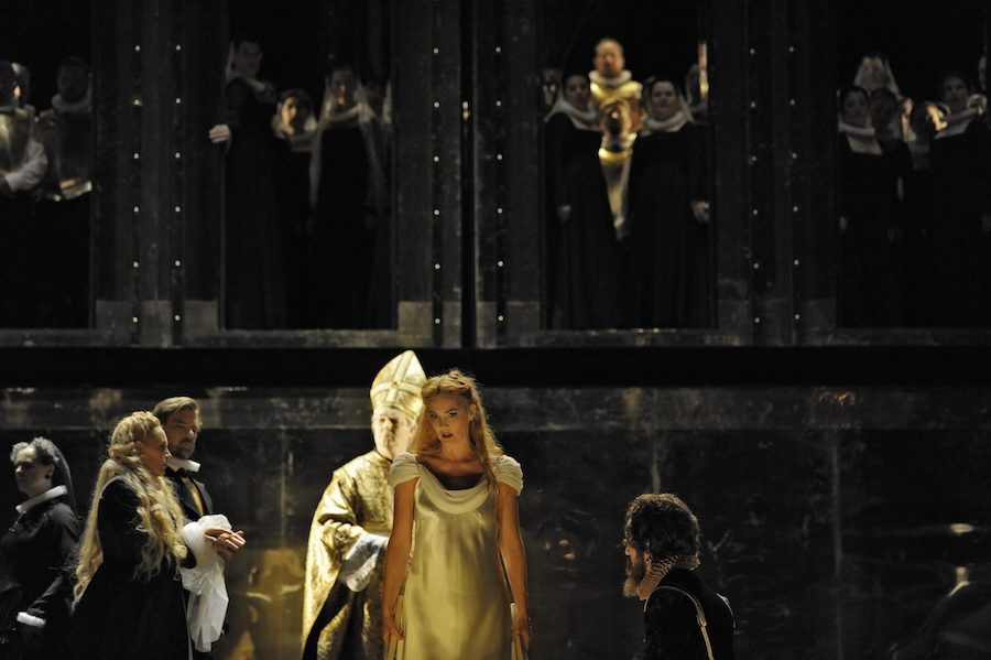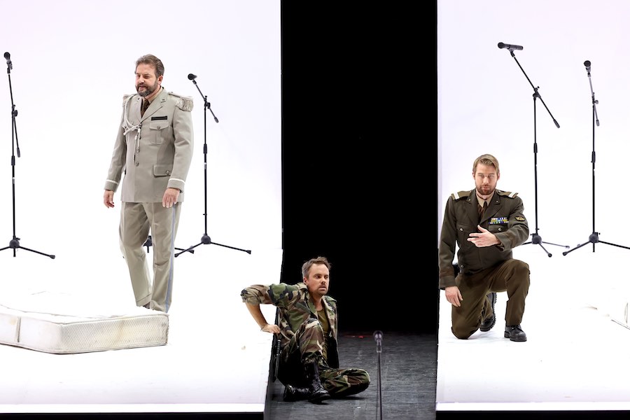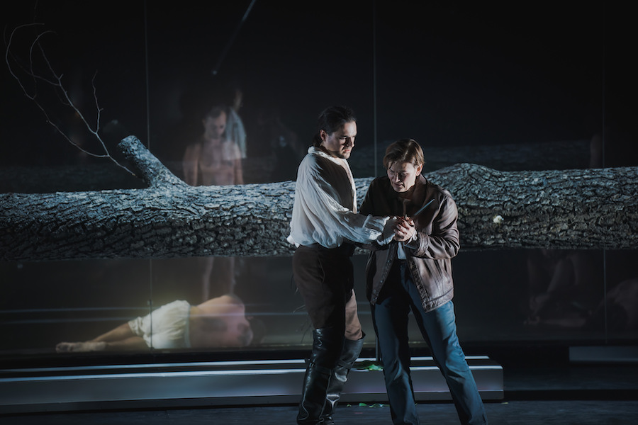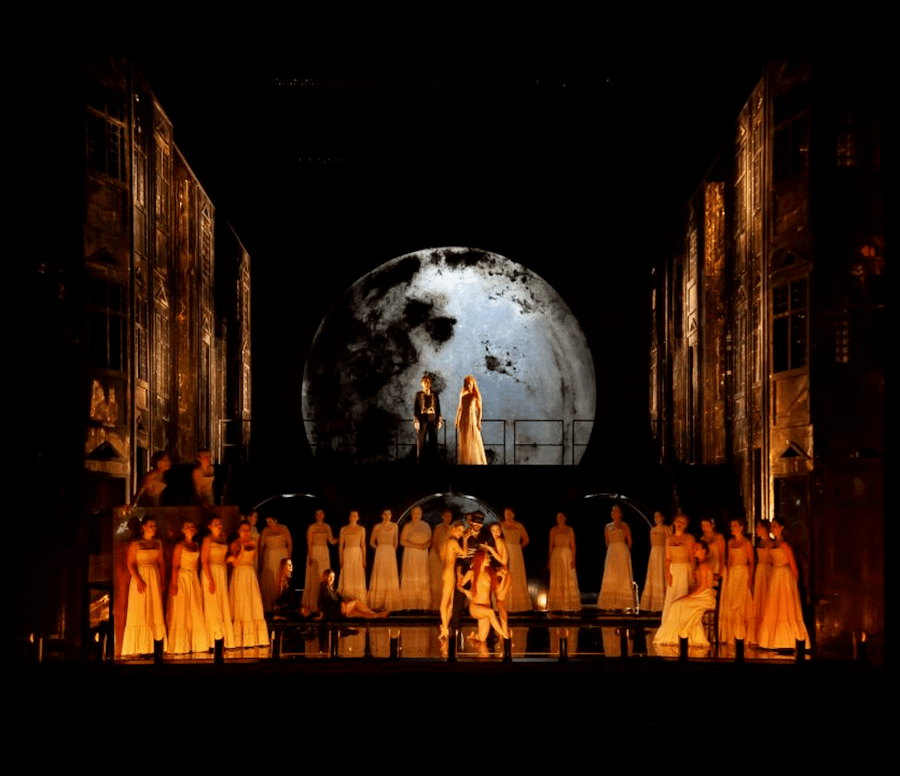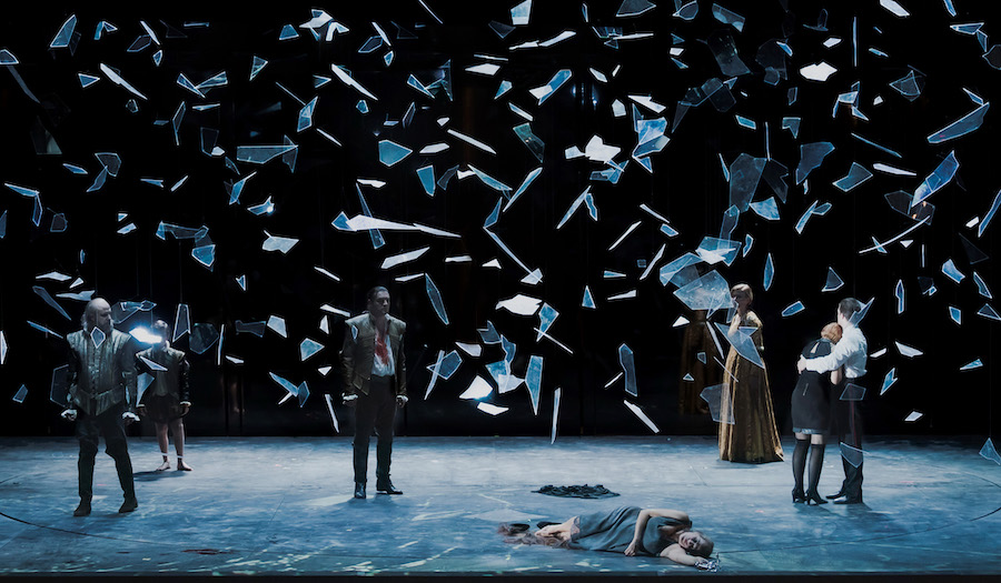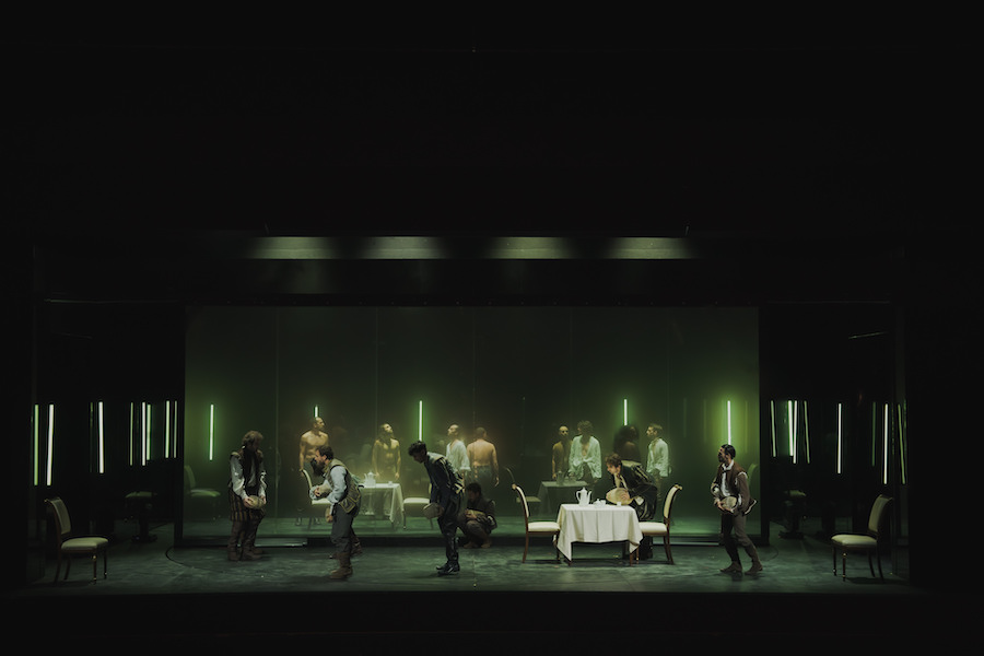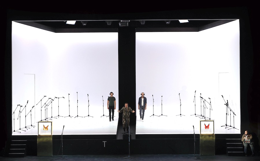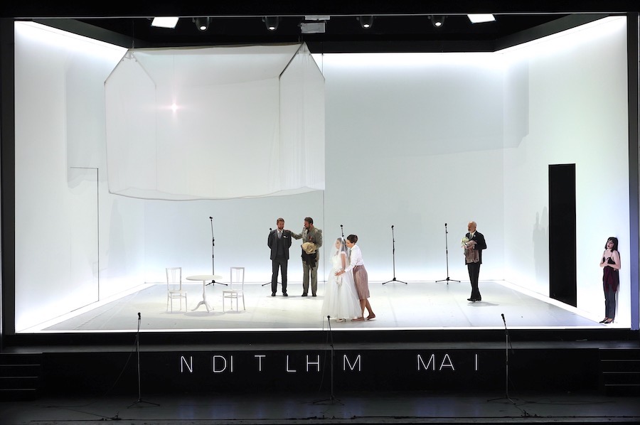 Non ha aiutato molto la fortuna di questo lavoro, soprattutto all’estero, il fatto di essere nella forma di opéra-comique, ossia con i dialoghi recitati. Tant’è che spesso questi stessi dialoghi sono accorciati o modificati, e non solo nei paesi non francofoni. Michieletto sceglie di concentrare la sua lettura sul contrasto tra le due coppie di amanti: quella più convenzionale di Hero e Claudio, e quella più istintiva di Béatrice e Bénédict, questi ultimi riflessi nella presenza di un Adamo ed Eva nudi e liberi nel giardino dell’Eden costretti poi a vestirsi e a finire in una teca di cristallo come le farfalle che erano state catturate all’inizio.