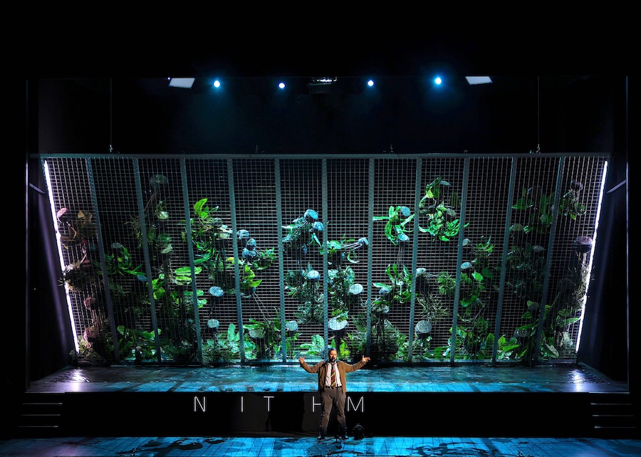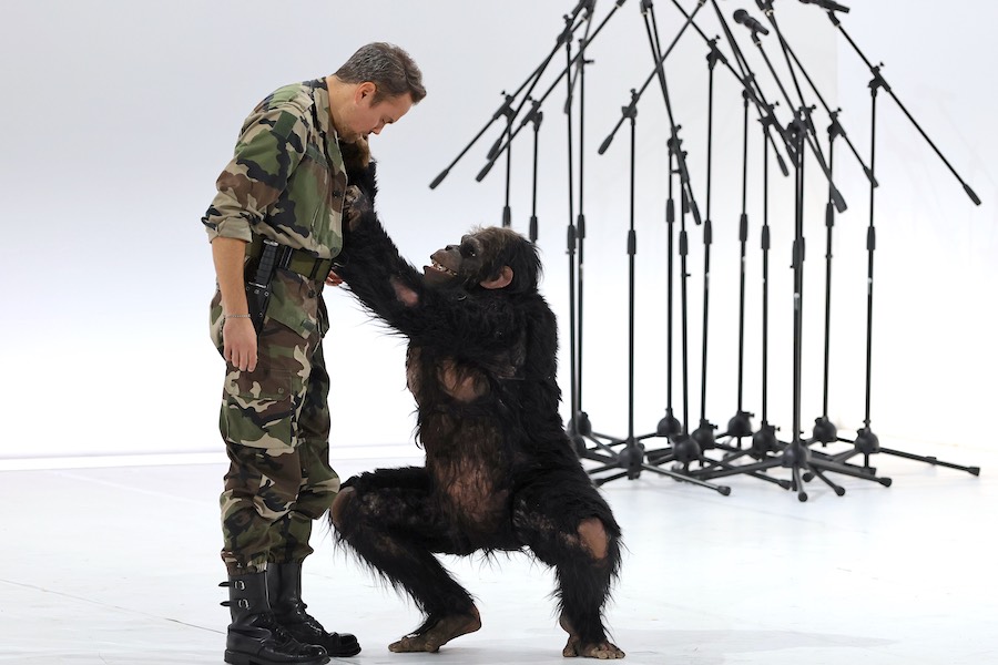 Visivamente il contrasto è realizzato efficacemente dalla scenografia di Paolo Fantin che al lussureggiante Eden, ahimè molto precario, alterna una scatola bianca che riflette la luce abbagliante della Sicilia in cui è raccontata la vicenda, un ambiente asettico e sollevato rispetto al proscenio, uno studio di registrazione ingombro di microfoni: le parole rubate, invece che su carta, sono incise su nastro magnetico che l’intrigante Somarone ha captato con il suo registratore. Quello di Béatrice e Bénédict è un esperimento sull’amore e dopo l’iniziale contrarietà al matrimonio, in seguito al viaggio in cui scoprono i loro sentimenti, alla fine si piegano alle convenzioni sociali pur con i possibili distinguo dettati dai loro accesi caratteri. Precedentemente anche il giardino dell’Eden è stato distrutto: la griglia su cui erano posate le piante in vaso si è sollevata ed è diventata una gabbia per lo scimpanzé, il lato istintivo e animale della specie umana libera dalle convenzioni.