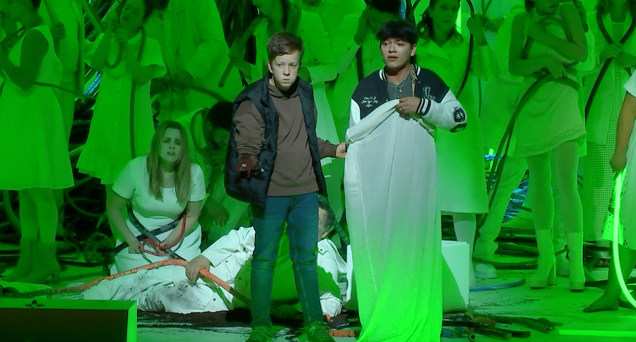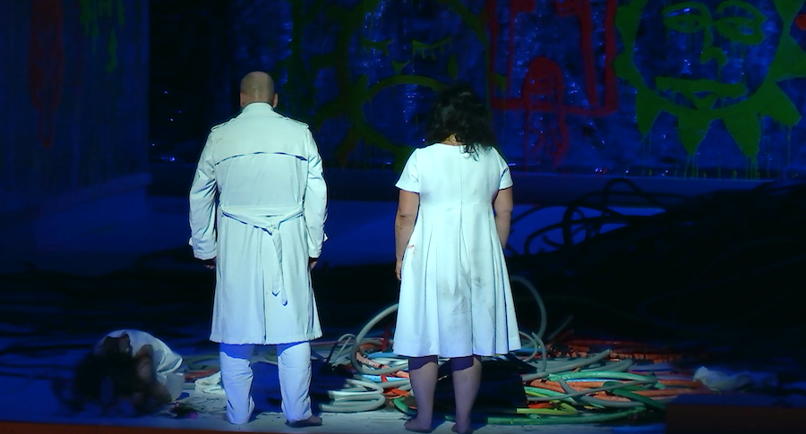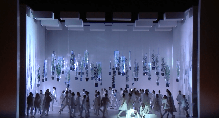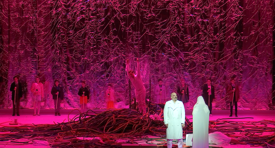 Qui è una donna (la regina?) che uccide il pretendente, la foresta è una gigantesca matassa di tubi colorati o fluorescenti, il bianco è per i costumi e per la vuota scatola che funge da scenografia (Rebecca Ringst), il nero quello di un corvo partorito dalla donna che ha intagliato l’osso. Le voci della cantata di Mahler non sono assegnate ai personaggi, ma a dei generici narratori i cui registri sono classicamente suddivisi in soprano, contralto, tenore e baritono. La voce del flauto è qui affidata a due giovanissimi cantori che rendono ancora più lancinante e inquietante questo strano lavoro. Ma nella drammaturgia di Sergio Morabito non si svolge granché: sulla scena per tutti i cinquanta minuti di musica i coristi non fanno che trasportare piante di plastica nella plastica o aggrapparsi ai cavi che penzolano. C’è terra, c’è sangue, la regina (?) si taglia la lingua, ma la musica solo a tratti si ritrova in quel che si vede.