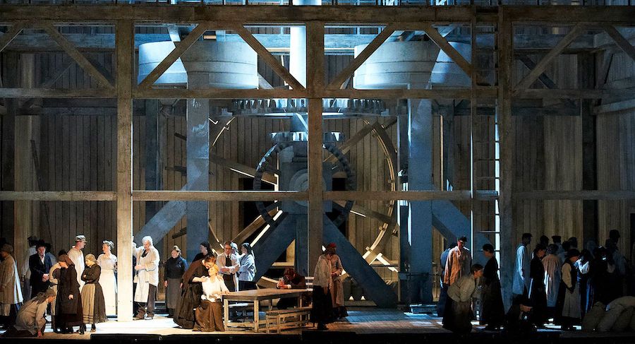 Nella scenografia di Robert Israel l’elemento dominante del primo atto è una gigantesca ruota che innesca altri meccanismi di un mulino che macina implacabile il destino dei personaggi; nel secondo atto i sacchi di farina sono accatastati come sacchi di sabbia a protezione delle pareti di un rifugio e una misera cesta di vimini è la culla dell’infelice piccolo Števa; più spoglio l’ambiente del terzo atto per le frugali nozze della coppia: un’enorme stanza, un ex magazzino, tutta rivestita di legno. Non c’è spazio per la natura in questo ambiente chiuso, i fiori e la pianta di rosmarino sono i pochi segni del mondo esterno che si presenta ostile, col suo gelo, il suo ghiaccio. Appropriati si rivelano i costumi di Marie-Jeanne Lecca così come le luci di Mimi Jordan Sherin. Nella sua sobrietà lo spettacolo messo in scena da Pountney non ha particolari elementi di novità, ma sfrutta abilmente le doti sceniche degli interpreti in un efficace gioco attoriale.