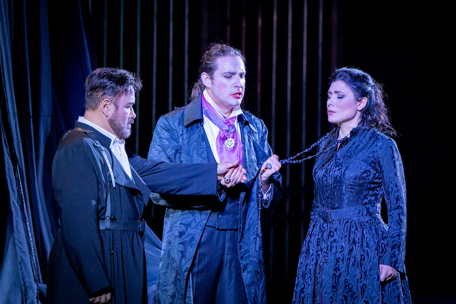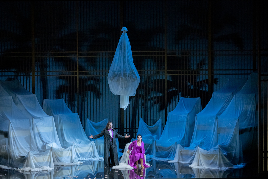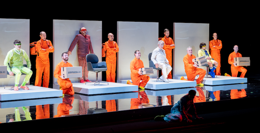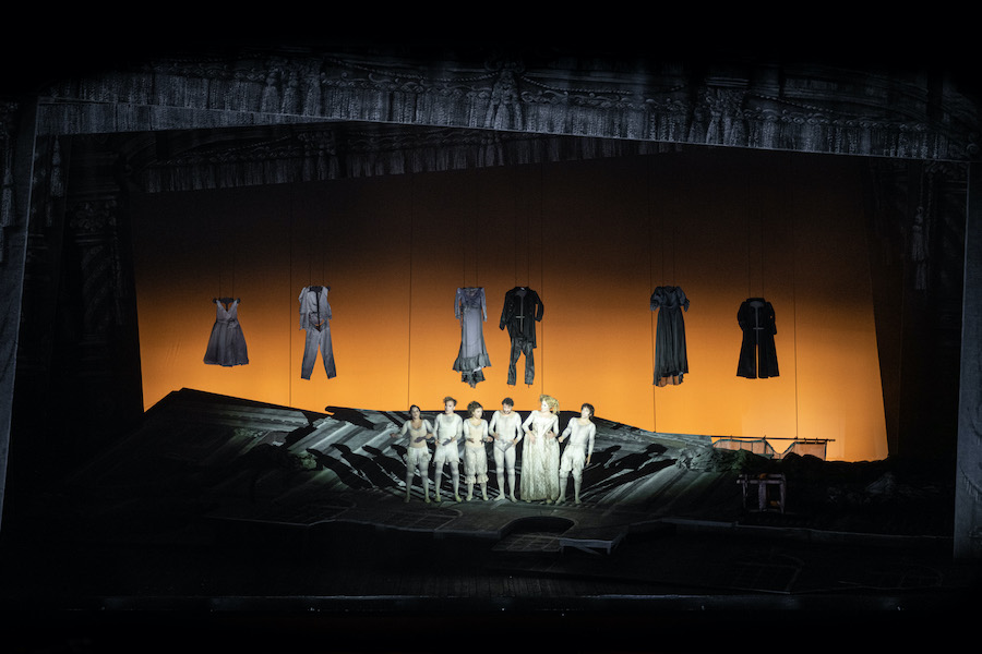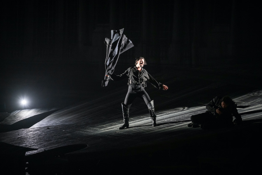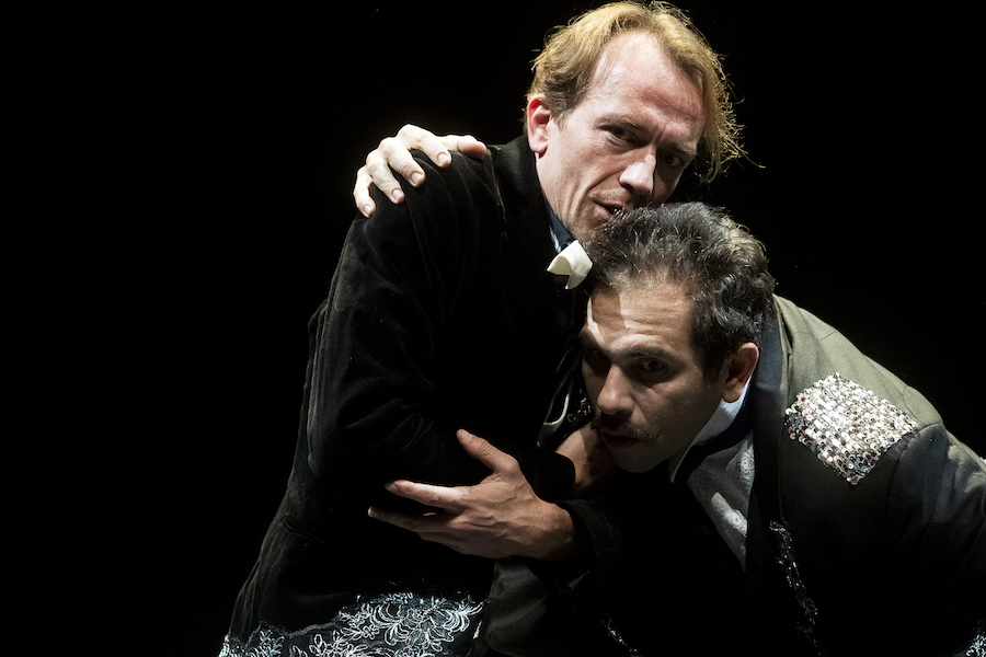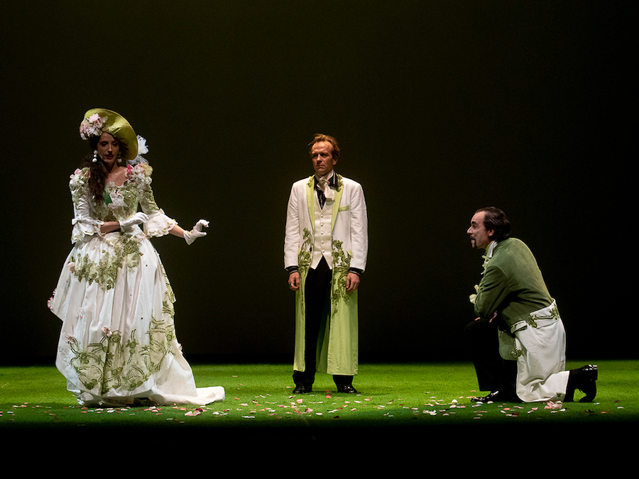 Il testo è un mirabile esempio di “marivaudage”, termine con cui si definisce lo scambio di espressioni galanti e raffinate, che connota i dialoghi tra la Marchesa e il Cavaliere a contrasto con la parlantina schietta e terrena dei due personaggi di Lisette e Lubin, quest’ultimo ennesima incarnazione del servo Arlecchino con la sua capacità di adattarsi ai diversi umori del padrone. In questa produzione il bravissimo attore Stefano Moretti dimostra tutta la vivace presenza scenica, addirittura acrobatica, che ci si aspetta da Arlecchino, così come la disinibita loquacità. E non ultimo il vestito, un’elegantissima rivisitazione del costume della maschera, disegnato come tutti gli altri da Luigi Perego il quale si occupa anche della minimalistica scenografia formata da teli neri (siamo all’interno della casa di una vedova!) che poi spariscono per un luminosissimo esterno quando i sentimenti della donna prendono una piega meno afflitta. Al pari vivace è la presenza scenica di Marcella Favilla, una Lisette pragmatica e concreta. Fabrizio Martorelli delinea un convincente Hortensius, con le sue saccenti e pedanti citazioni e i suoi fallaci sillogismi. Il più introverso e contorto è il Cavaliere, a cui Lorenzo Gleijeses presta i suoi tic e le sue fisime. Presente solo nella seconda parte, il Conte di Giuseppe Nitti mostra la sua tronfia sicurezza prima della sconfitta. Daria Pascal Attolini è quella che come Marchesa tiene la scena più di tutti gli altri personaggi sviluppando con il suo lucido eloquio l’evoluzione dei suoi sentimenti, una bella prova attoriale.