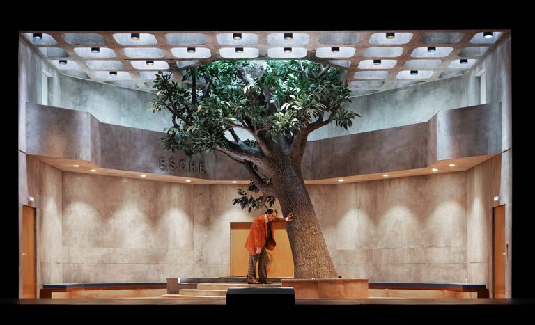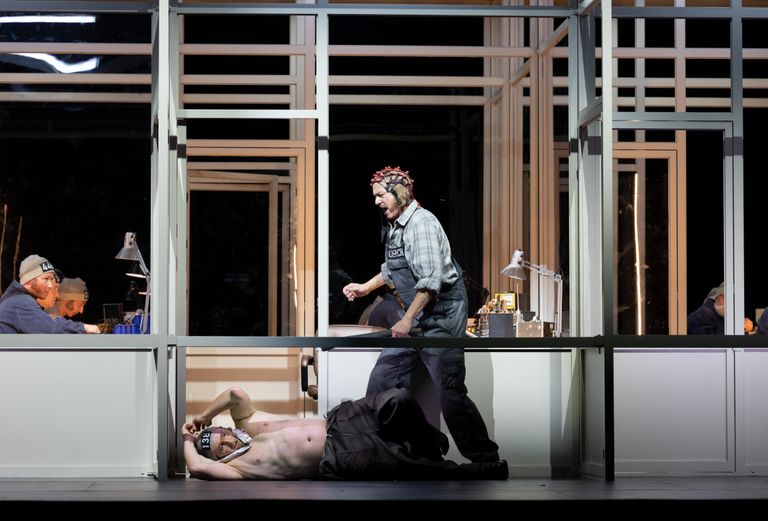 La natura è del tutto assente nella sua messa in scena: siamo infatti all’interno di un grande laboratorio, l’E.S.C.H.E. (Experimental Scientific Center for Human Evolution, ma Esche è anche il nome tedesco del frassino, la pianta nel cui tronco è infissa la spada di Wotan) e ne vediamo la mappa del terzo piano proiettata sul sipario. Durante il Preludio assistiamo a un video in cui un liquido iniettato nel cervello ce ne mostra l’intricata struttura neuronale e il primo personaggio che vediamo è Alberich, osservato da scienziati mentre è sottoposto a prove di stress che sfociano in violenza: dopo l’episodio con le “figlie del Reno”, qui scienziate in camice bianco che studiano le sue reazioni, il soggetto si strappa gli elettrodi dal capo, devasta il laboratorio e scappa con tabulati e apparecchiature elettroniche, l’“oro” che dà il potere. Vedremo poi scorrere davanti ai nostri occhi i vari ambienti, non solo in orizzontale, ma anche in verticale, di un impianto scenografico, quello di Černjakov stesso, che sfrutta le capacità tecnologiche del teatro affacciato sull’Unter den Linden.