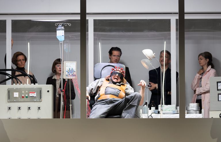 La natura è del tutto assente nella sua messa in scena: siamo infatti all’interno di un grande laboratorio, l’E.S.C.H.E. (Experimental Scientific Center for Human Evolution, ma Esche è anche il nome tedesco del frassino, la pianta nel cui tronco è infissa la spada di Wotan) e ne vediamo la mappa del terzo piano proiettata sul sipario. Durante il Preludio assistiamo a un video in cui un liquido iniettato nel cervello ce ne mostra l’intricata struttura neuronale e il primo personaggio che vediamo è Alberich, osservato da scienziati mentre è sottoposto a prove di stress che sfociano in violenza: dopo l’episodio con le “figlie del Reno”, qui scienziate in camice bianco che studiano le sue reazioni, il soggetto si strappa gli elettrodi dal capo, devasta il laboratorio e scappa con tabulati e apparecchiature elettroniche, l’“oro” che dà il potere. Vedremo poi scorrere davanti ai nostri occhi i vari ambienti, non solo in orizzontale, ma anche in verticale, di un impianto scenografico, quello di Černjakov stesso, che sfrutta le capacità tecnologiche del teatro affacciato sull’Unter den Linden.