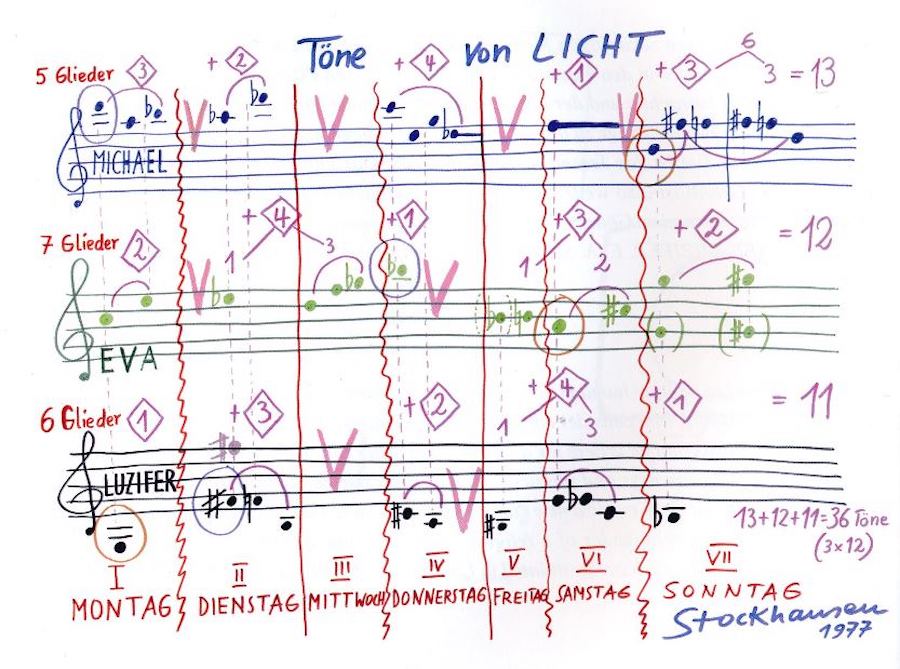 Depuis les années 1960, Karlheinz Stockhausen a développé son propre théâtre liturgique de sons et de concepts avec une approche méta-religieuse, dans laquelle son catholicisme assimile d’autres religions (judaïsme, hindouisme, bouddhisme, shintoïsme) dans une forme de syncrétisme qu’on pourrait qualifier de désinvolte ! Le compositeur a voulu représenter une « totalité », une métaphore de Dieu, vécue comme une expérience mystique, et Licht (Lumière) est le fruit le plus ambitieux de cette quête, un immense cycle de sept œuvres proposant plus de vingt heures de musique, réparties selon les jours de la semaine…