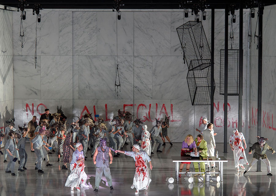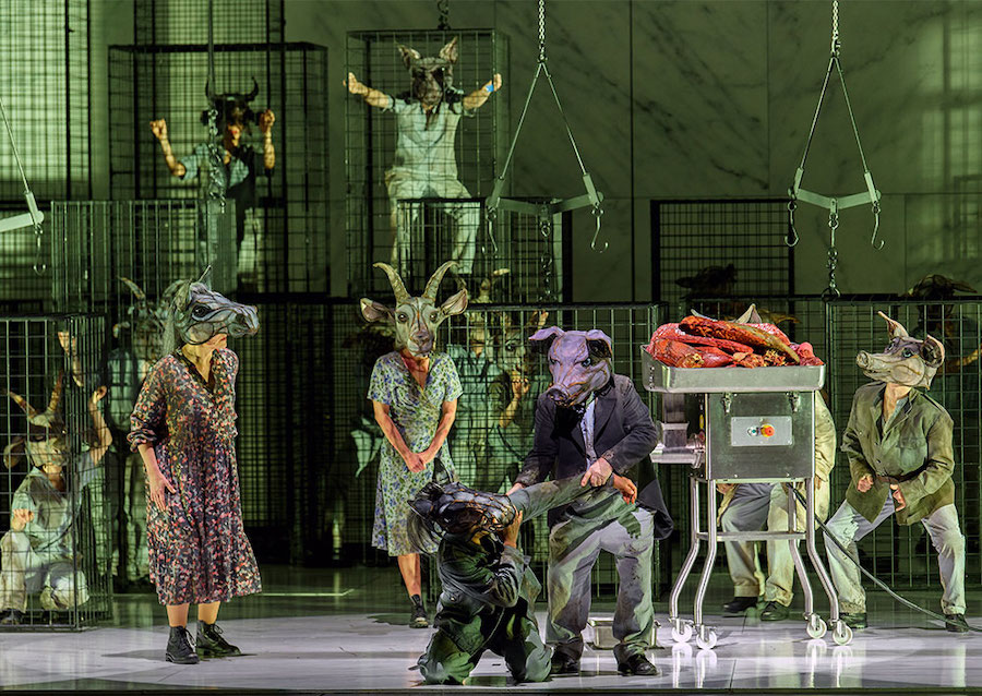 Le tecniche vocali poi sono di una ricchezza inusuale e con una gamma che va dal registro basso e solenne di Old Maijor, da pope ortodosso, ai suoni perforanti di Squealer, alle colorature stratosferiche di Mollie. Il risultato è un’opera musicalmente godibilissima che sorprende per la varietà dei colori e degli stili. Il tutto riceve un impulso fondamentale dalla messa in scena di Michieletto, che si adatta perfettamente al tono della vicenda: l’ambientazione atemporale è quella di un asettico mattatoio dalle pareti di marmo bianco e dalle fredde luci al neon – Paolo Fantin dice di essersi ispirato a quello di Roma – con gabbie di ferro che racchiudono il “nostro cibo”. Michieletto qui forse si ricorda del suo allestimento de Il dissoluto punito, il Don Giovanni Tenorio di Ramón Carnicer i Batlle ambientato in una macelleria, presentato a La Coruña nel 2006. Qui i personaggi vestono maschere di animali che poi a poco a poco abbandonano per diventare sempre più simili agli uomini, con tutti i loro vizi. Anche i comandamenti scritti a vernice rossa sui muri vengono a mano a mano modificati con vernice nera. Le gabbie spariscono e lasciano posto nel finale a divani di velluto e a lampadari di cristallo quando la trasformazione degli animali negli umani tanto odiati è definitivamente completa.