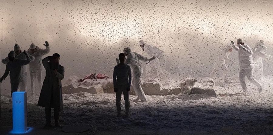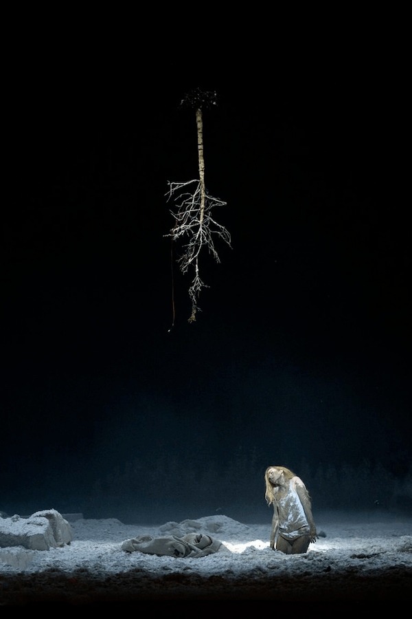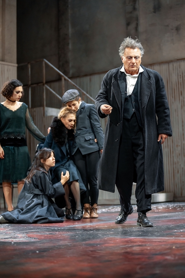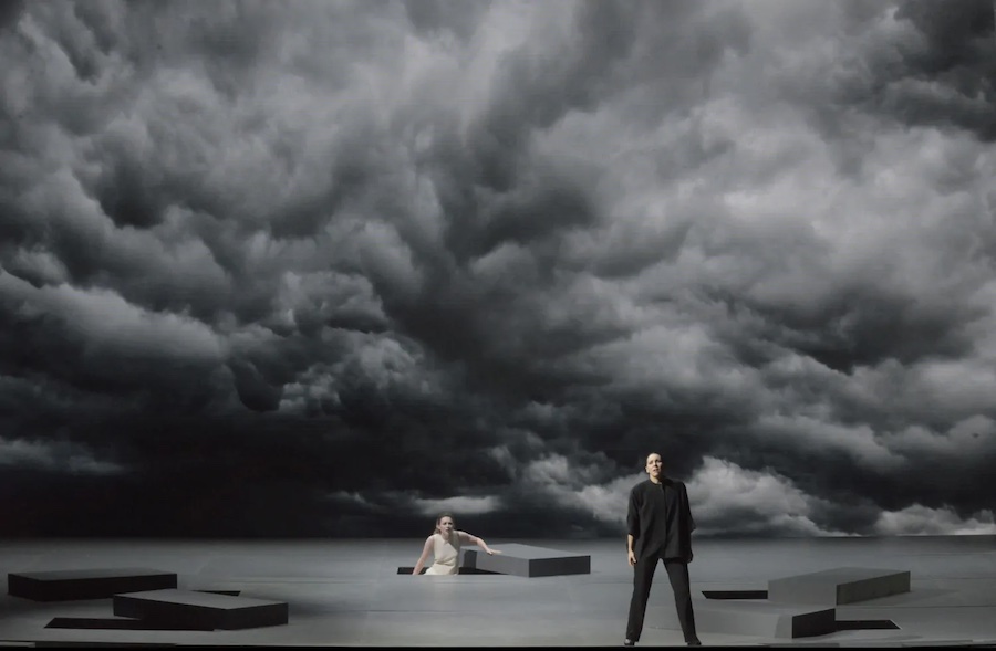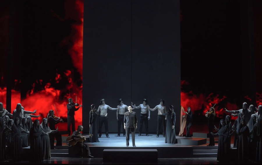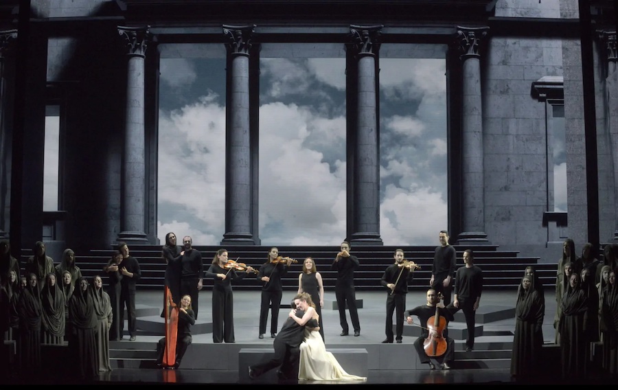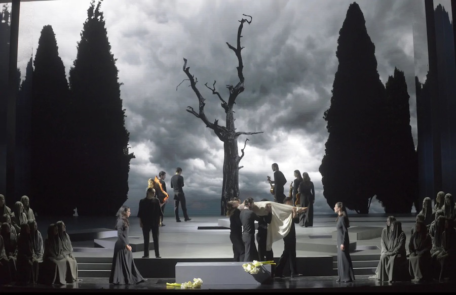 Una sintesi non solo sonora ma anche visiva, così come avviene nella depurata messa in scena di Pier Luigi Pizzi, il decano degli scenografi italiani che aggiunge questa ennesima esperienza alla sua frequentazione del teatro gluckiano. In scena vediamo delle pietre tombali che rimandano alle visioni cimiteriali della poesia pre-romantica di Thomas Gray (Elegy Written in a Country Churchyard), di Robert Blair (The Grave), di Edward Young (Night Thoughts) o del nostro Ugo Foscolo (Dei sepolcri). In una di queste tombe verrà calato il corpo esanime di Euridice. Lo sfondo della scena è un grande schermo su cui vengono proiettate figure di cipressi e di un albero scheletrico, un cielo cangiante di nubi tempestose o squarci di sereno, una superficie marina, le fiamme dell’Erebo. Nel finale appare la facciata della Fenice: anche lei rinata, più volte, dopo la morte (gli incendi) grazie all’amore per il teatro.