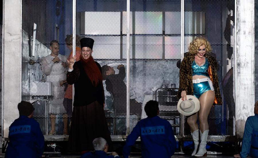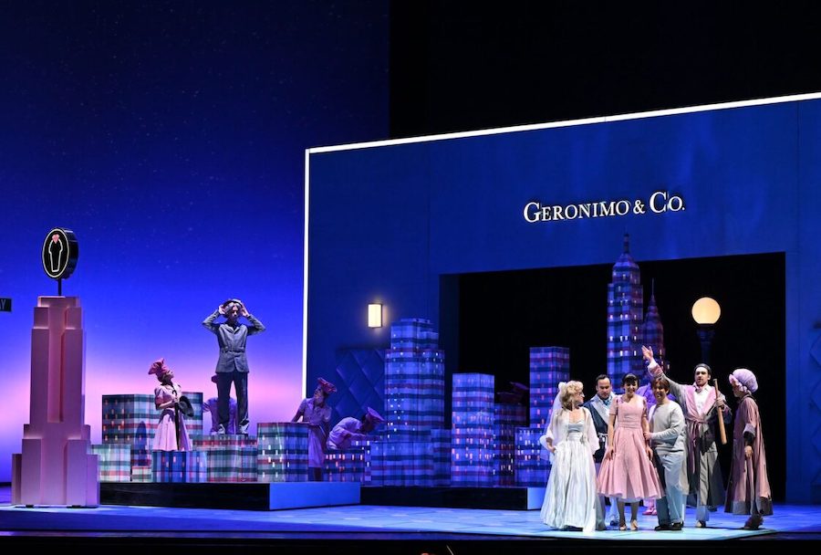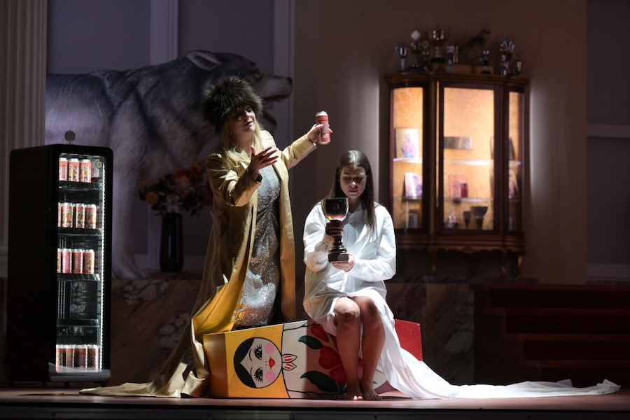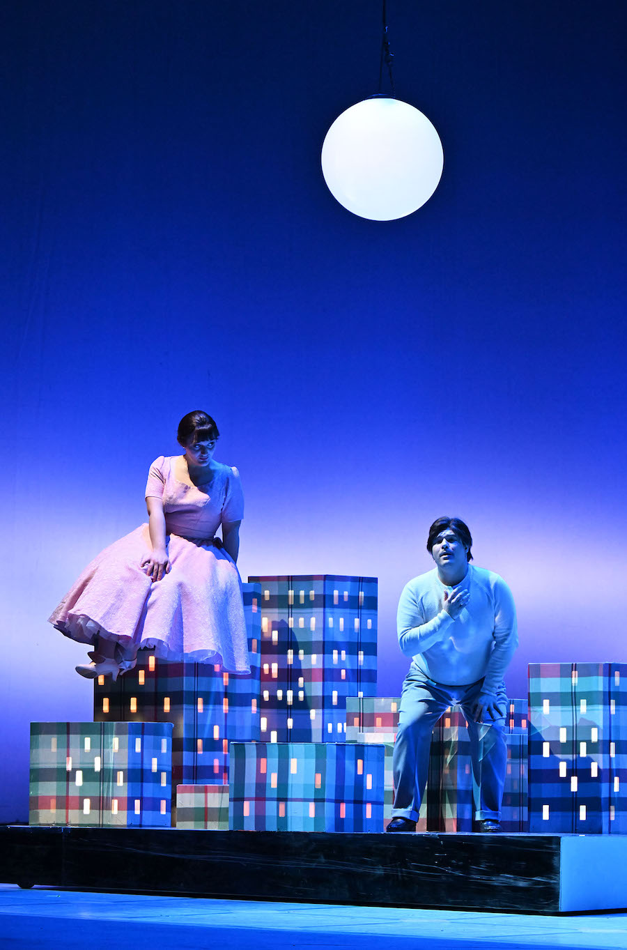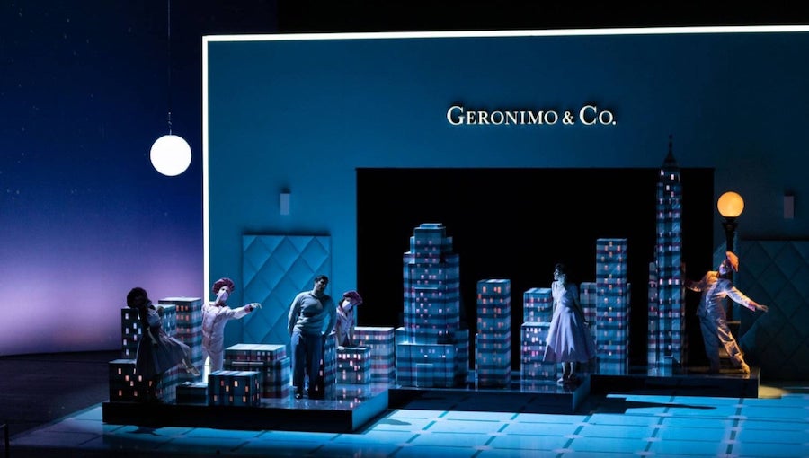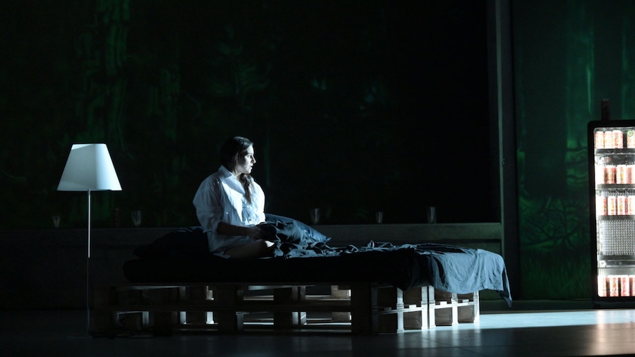 Questa nuova produzione della Bayerische Staatsoper segna la prima in lingua inglese dell’opera nella traduzione di Amanda Holden. La neve è protagonista nella fiaba di Andersen e lo è anche nella messa in scena di Andreas Kriegenburg, una versione per adulti della favola. Che la Regina delle Nevi sia interpretata da un basso, che chieda a Kay di venire a baciarla e di essere protetta nel suo cappotto, che Gerda si conceda uno spazio per dormire nel letto del Principe, o ancora che Gerda baci appassionatamente la renna, sono tutti elementi che indicano qualcosa di molto oscuro, una corrente di abusi che si nasconde sotto il candore immacolato delle immagini. Nella sua lettura Kriegenburg prende il rapporto personale tra Gerda e Kay e lo sviluppa in una storia di ricerca disperata di Gerda per riconquistare il suo unico vero amore, che apparentemente soffre di apatia e mutismo dopo aver subito chissà quale trauma. Quale sia stato questo trauma infatti non è chiaro. La sua è una messa in scena che è una meditazione sulla memoria, che trascende il tempo con molteplici versioni di Gerda e Kay, da bambini, adolescenti o adulti, in ogni momento o contemporaneamente, con il Kay adulto interpretato da un attore, l’intenso Thomas Gräßle. L’ambiente ricostruito nella scenografia di Harald B. Thor è quello di un ospedale: lettini, pigiami, suore infermiere. La presenza di altri pazienti suggerisce che il trauma di Kay non è unico. I vari piani di profondità della scena sono separati da teli traslucidi e cade in continuazione neve, tanta neve. Ricchi e suggestivi i costumi di Andrea Schraad e particolarmente riusciti quelli dei corvi.