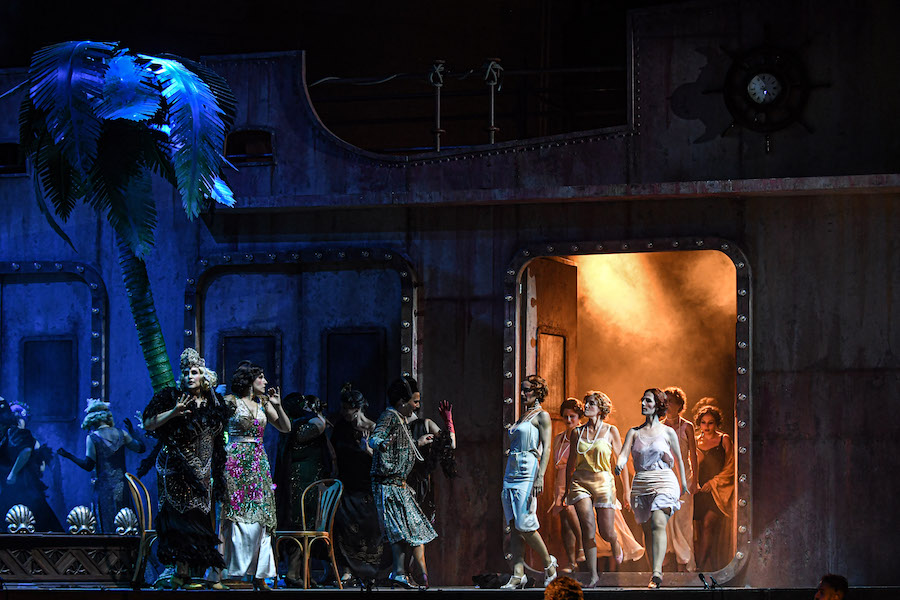L’aspetto visivo dello spettacolo ha trovato la magia del tocco di Alessandro Talevi, che ha ambientato la vicenda nella sala da ballo di un transatlantico negli anni ’30, sottolineando così il gusto per l’esotico dell’Italia di allora mentre si costruiva un impero oltre mare. Con le belle scene e gli eleganti costumi d’epoca di Anna Bonomelli, il regista si sbarazza dell’Olanda prevista dal libretto, ma del tutto assente nella musica, nei nomi dei personaggi e nella loro vicenda, per ricreare l’Italia tra le due guerre, un periodo dove si realizzavano nuove opportunità ma nello stesso tempo si vivevano nuove repressioni per le donne, le quali per Mussolini dovevano ritornare a un destino dedicato alla procreazione. «In un certo senso, la storia de Il paese dei campanelli è un riflesso di un cosmopolitismo sottosopra degli anni ’20 e del suo oscurarsi verso il nazionalismo e militarismo degli anni ’30», scrive Talevi, «la rigidità stordente del codice morale seguito nel paese dei campanelli è in contrasto con la moralità liberale personificata dagli “esotici” inglesi e può forse essere letta attraverso la prospettiva italiana di quel tempo, un “guardare al di fuori” verso qualcosa di moderno, affascinante, straniero, desiderabile in un paese ancora dominato dalla struttura maschile e conservatrice di Chiesa e Stato». Ecco allora che dopo il breve momento di liberazione vissuto dalle donne con i cadetti, tutto ritorna nella solita tetra normalità. L’unica che si salva in questa produzione è la brutta Pomerania che alla fine riesce a imbarcarsi sulla nave. Chissà, il digiuno e la lontananza da casa indurranno qualche giovane ad accontentarsi anche della vecchia…