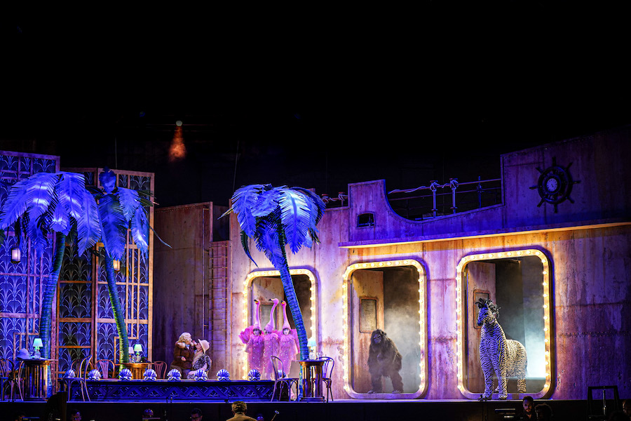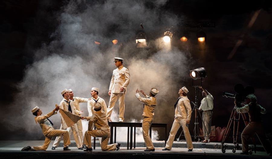 Talevi riesce a risolvere con grande intelligenza questa assurda vicenda di scambio di coppie scandita dall’alternanza di lunghi dialoghi recitati con momenti cantati e ballati costruendo un ambiente artificiale dove tutto è possibile, anche che entri una zebra e si metta a ballare tra le coppie. Sotto palme finte che danno il tocco esotico, gli abat-jour dei tavolini da tabarin con la loro luce sfarfallante simulano il tintinnare dei maledetti campanelli. Sulla destra tre portelloni danno accesso alla rugginosa fiancata della nave sul cui ponte superiore si vedono sfilare prima i cadetti, poi «le inglesine» con i mariti in mutande colti in flagrante adulterio. In mezzo una pedana per le esibizioni danzate, uno spazio ridotto per le quattro girls e i quattro boys del balletto che hanno fatto meraviglie con le ironiche e gustose coreografie di Annamaria Bruzzese. Tocchi di surreale umorismo punteggiano la paradossale vicenda che si dipana con ritmo preciso e una divertita e divertente partecipazione di tutti gli artisti coinvolti: cantanti, attori, ballerini, coristi.
