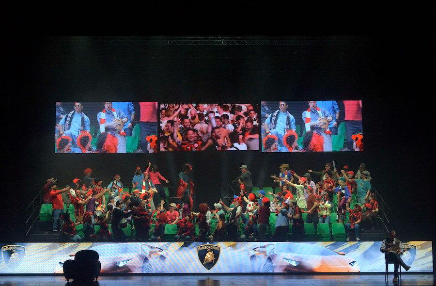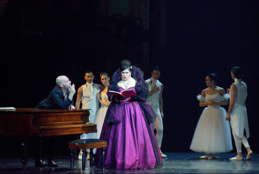 Una coppia di francesi ha allestito l’attuale Sonnambula di Roma, un’altra coppia francese ha messo in scena questo spettacolo veneziano, ma con risultati nettamente diversi: se al Costanzi la regia è stata accolta da rumorosi dissensi, qui alla Fenice i creatori della parte visiva sono stati accomunati nelle ovazioni a quelli della parte musicale. Patrice Caurier e Moshe Leiser, quest’ultimo anche per le scene, con i bellissimi costumi di Agostino Cavalca, il geniale light design di Christophe Forey, il sobrio ma efficace video design di Etienne Guiol e la gustosa coreografia di Beate Vollack hanno concepito uno spettacolo che si è rivelato gioiosamente godibile, molto ben costruito e soprattutto perfettamente in linea con lo spirito dissacratore e iconoclasta dell’opera. Ambientato nel presente, dell’attualità ha denunciato i problemi senza però deviare dalla linea del racconto che è stato rispettato alla lettera così come è stato fatto con la musica.