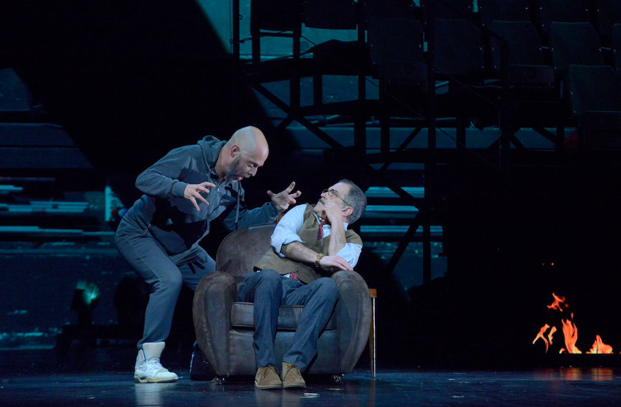 Il prologo non si svolge in cielo, ma nel salotto di Mefistofele il quale, dopo aver consegnato la sua partitura al direttore d’orchestra, si toglie le corna, si sveste e fa la doccia. Poi si rimette la felpa e si sprofonda in poltrona dove invece delle falange celesti e dei cori mistici segue una trasmissione col Papa: il telecomando che non funziona costringe il diavolo a seguire CattoTv! La scena è quella vuota del teatro dietro le quinte, ma dall’alto scende la scatola/stanza di Faust e se non fosse per un violoncello appoggiato a una sedia, lo si scambierebbe per un grigio impiegato del catasto dalla mesta figura, l’uomo giusto da adescare e a cui promettere i servigi per le sue voglie in questa vita. Infatti, dopo la scena della festa di Pasqua magnificamente realizzata (una vivacissima partita di calcio con la squadra del Francoforte…), il misterioso frate grigio propone il contratto e inizia il viaggio – un trip provocato da un’iniezione di eroina – verso «l’orgie ghiotte».